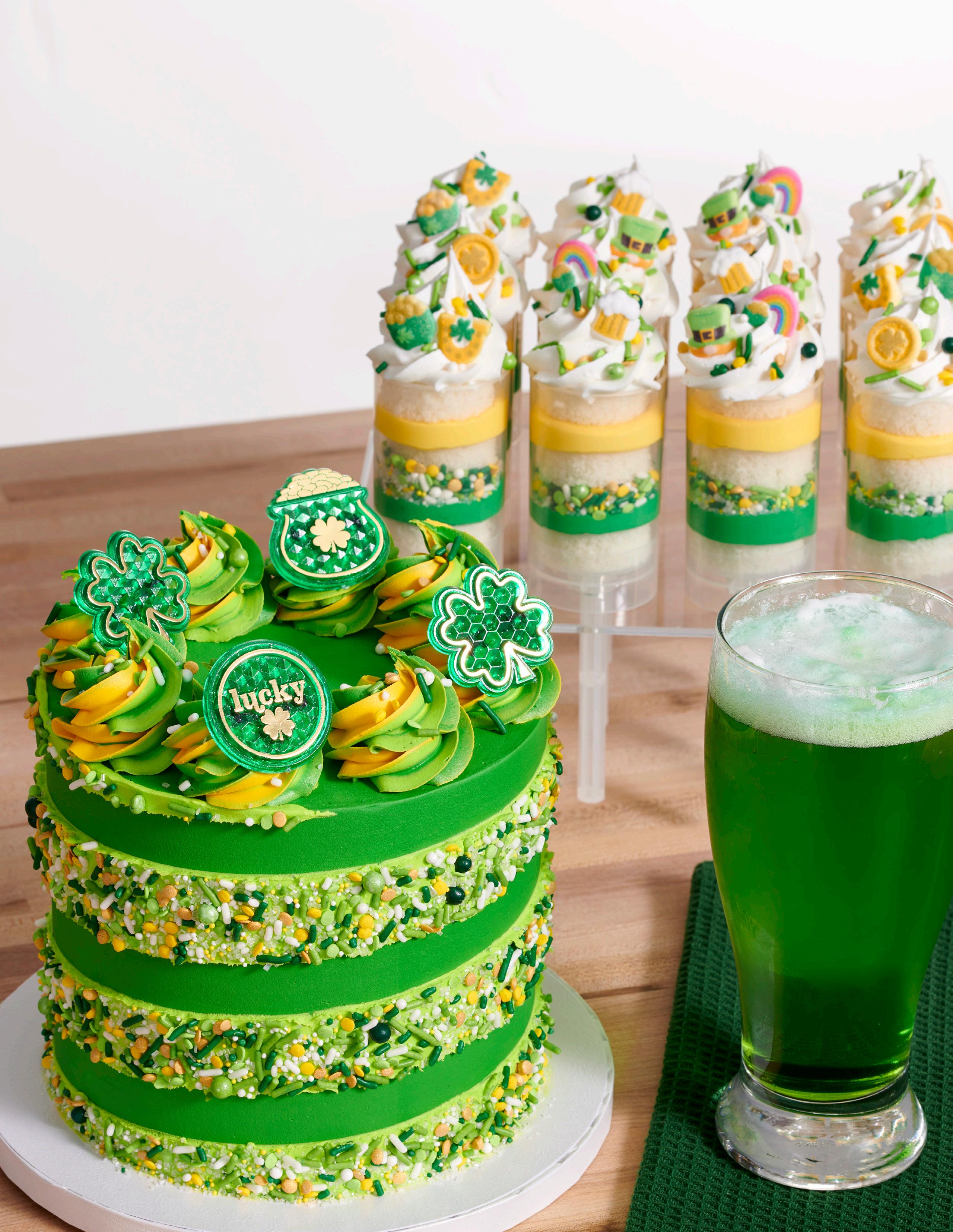 Shown: #26343 Happy St. Patrick’s Day PhotoCake® Edible Image®, #20688/8782 Green Edible Glitter, and #9784 Round Assorted Sizes Cutters