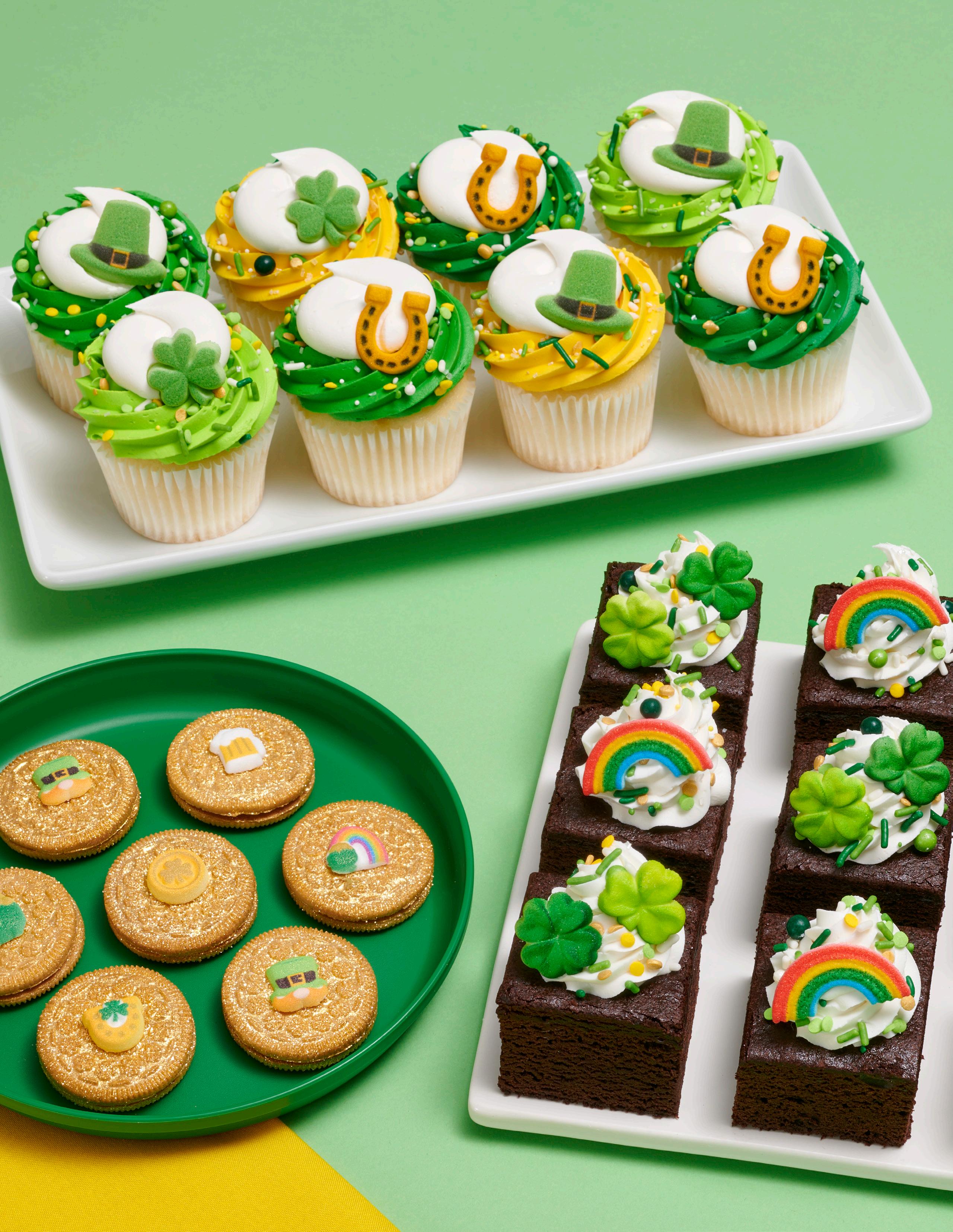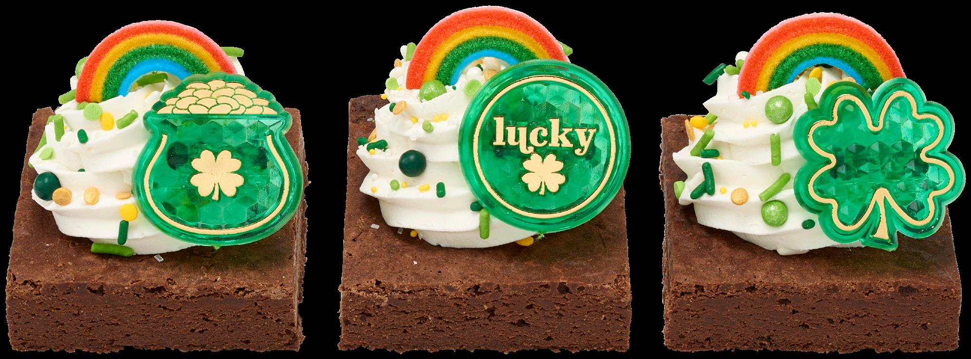 Shown on brownies: #29115 Happy Go Lucky Deluxe Fusion Mix, #50574 Lucky Shamrock Set Dec-Ons®, and #41206 Primary Rainbow Dec-Ons®