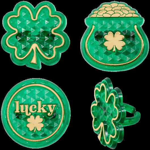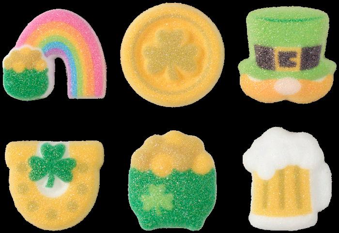 Shown on gelatin cups: #29114 Leprechaun Luck Assortment Dec-Ons®, #41580 Shamrock Puffy Glitter Rings, #26340 Gold Lucky Cupcake Layon, #29376 Bright Gold Dust Edible Glitter, and #29115 Happy Go Lucky Deluxe Fusion Mix