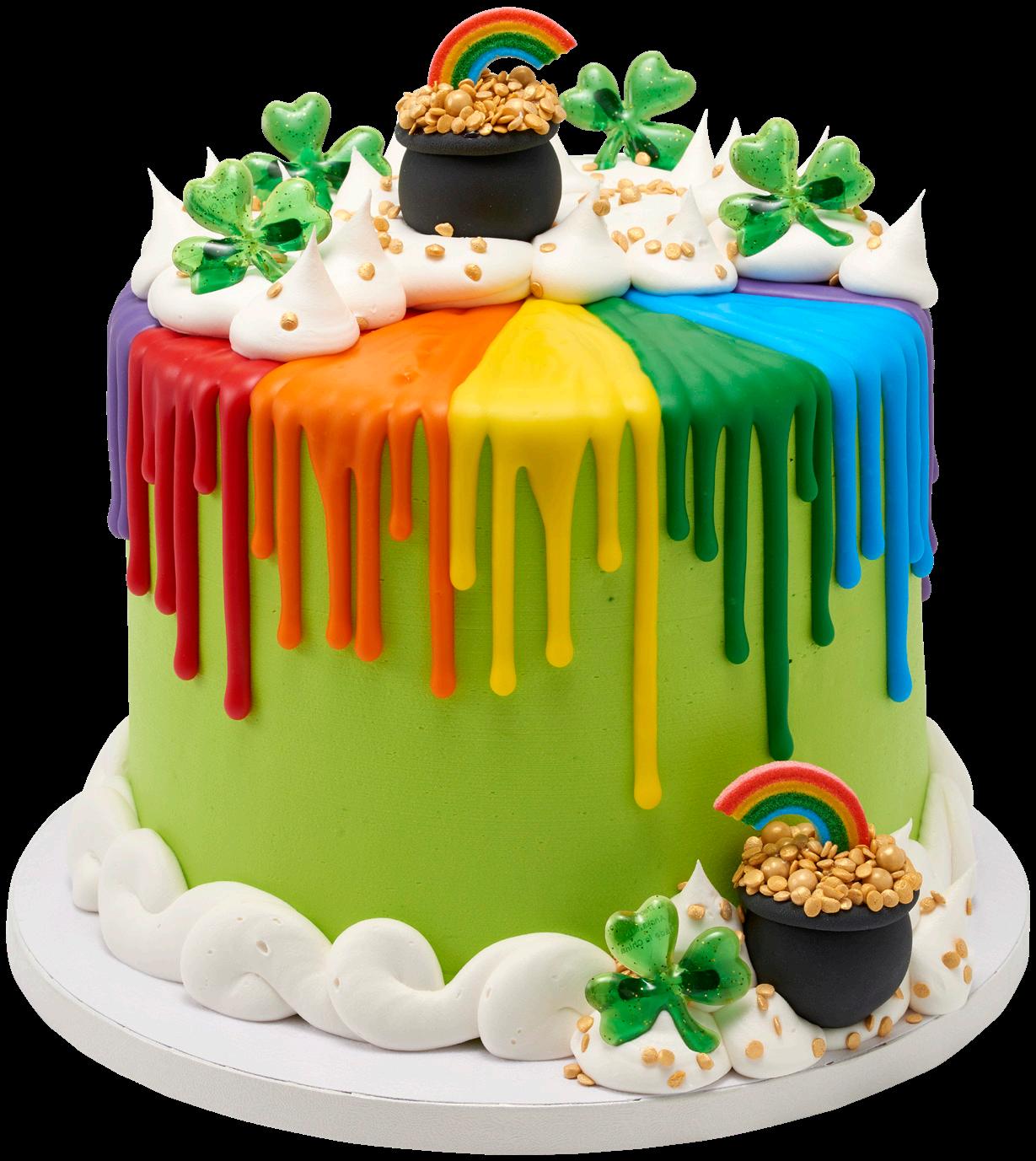 Shown on 8” double layer round: #26343 Happy St. Patrick’s Day PhotoCake® Edible Image®, #22941 St. Patrick’s Day Fusion Mix, #20700/9739 Orange Sprinkles, and #50574 Lucky Shamrocks Dec-Ons®