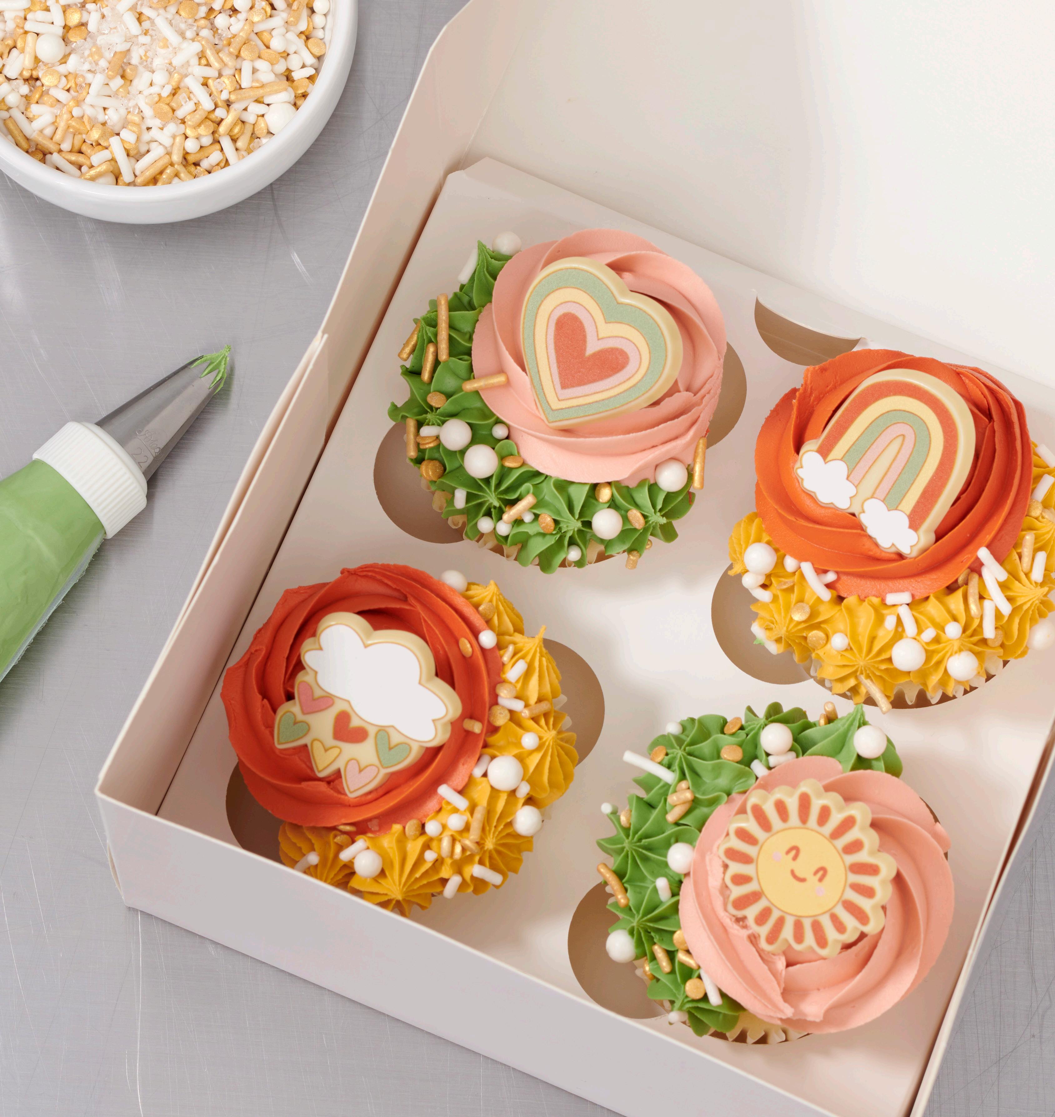 Shown: Cupcakes in #24839 White 4 Count Cupcake Box with #28781 You are My Sunshine Rings and #27697 Celebration Wishes Deluxe Fusion Mix; Premium Gel Colors: #22518 Honey, #22502 Golden Yellow, #22508 Teal Green, #22523 Stone Gray, #21396 Firestone, #22501 Sunset Orange, #22507 Olive Green, and #26796 Golden Brown; Decorating Tips: #5009 #1M Deep Cut Open Star, #11074 #22 Star, and #11035 #32 Star