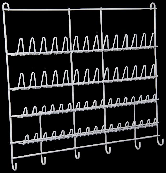 Convenient wall-mounted rack for storing tips and pastry bags. Powder-coated metal. Holds 62 tips.