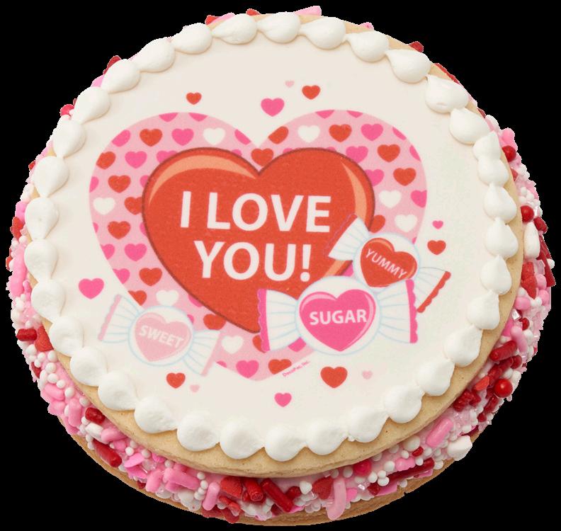 Shown on 4” round: #26355 Happy Galentine’s Day PhotoCake® Edible Image® and #21332/8461 Mini Hearts Quins