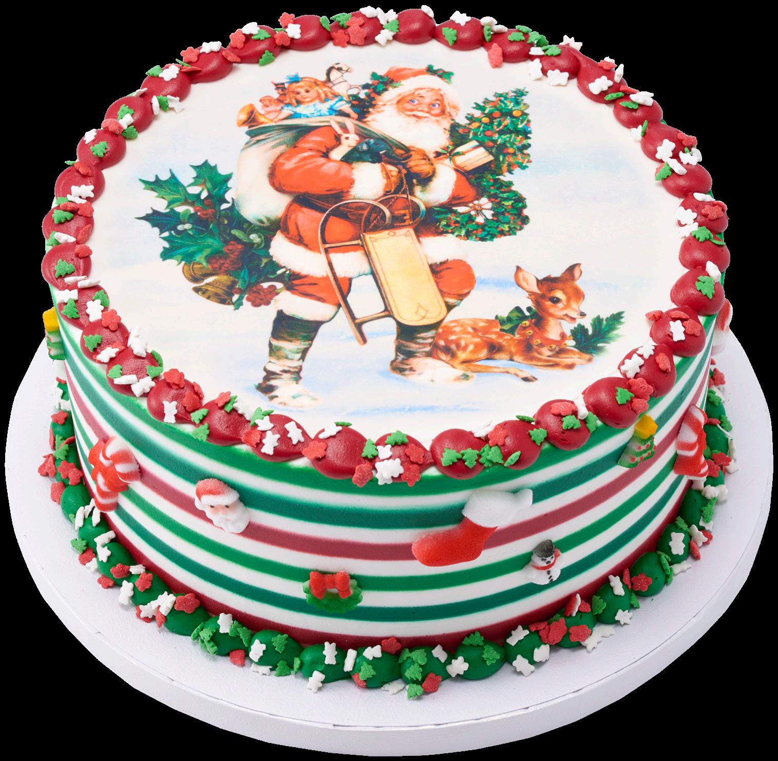 Shown on 8” double layer round: 27405 Delivering Toys PhotoCake® Edible Image®, #13442 Christmas Charms Assortment Dec-Ons®, and #48784 Deluxe Holly Jolly Assortment Dec-Ons®