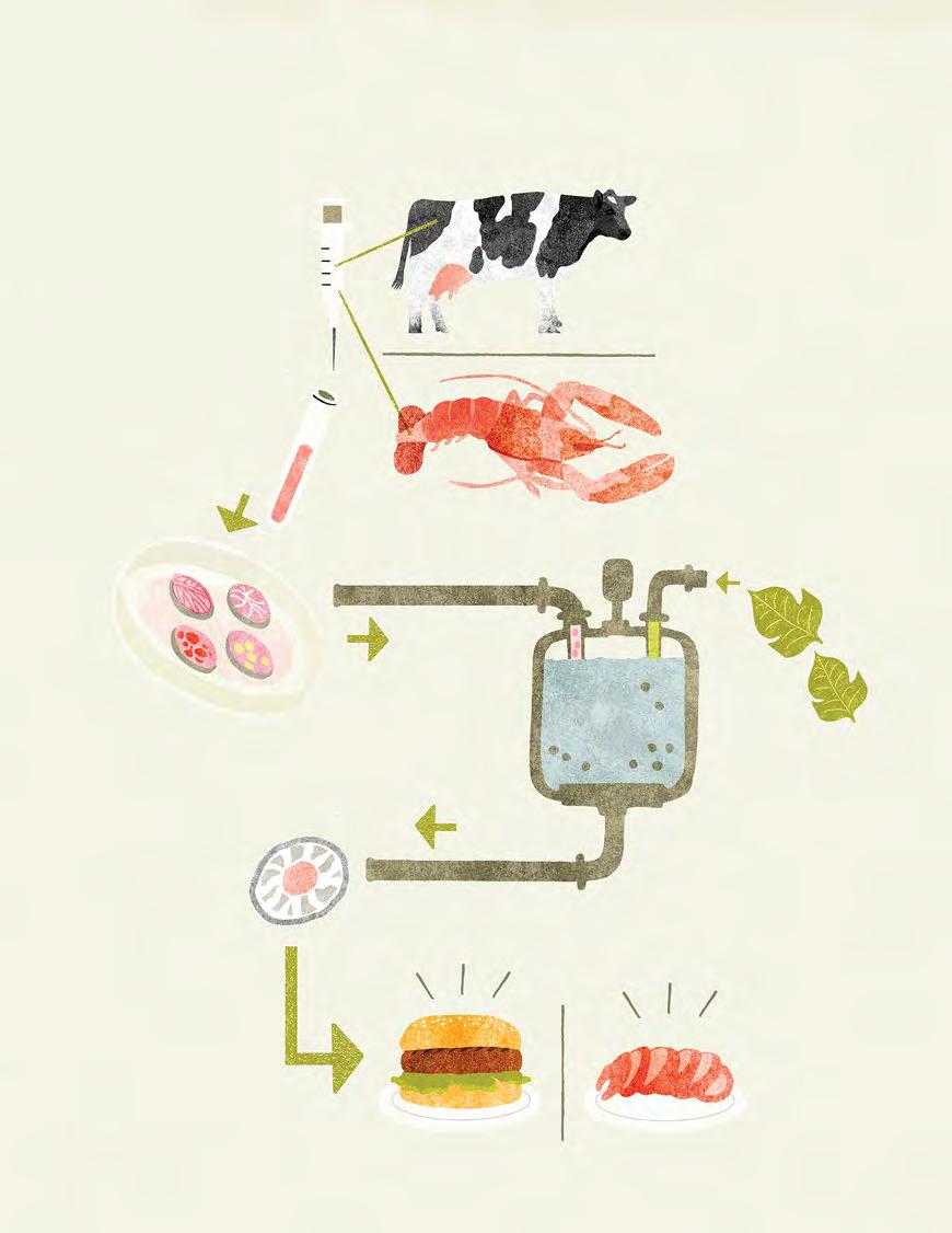 Cellulaire landbouw begint met een biopt zo klein als een sesamzaadje, dat met een prik in de bil of elders in het lichaam van een dier wordt afgenomen. In principe kunnen vervol gens alle dierlijke producten met dier lijke cellen worden nagemaakt. Vlees, vis en zuivelproducten, maar ook leer, collageen, zijde en wol. Met deze technologie kunnen we miljarden dierenlevens sparen en tegelijkertijd veel meer voedsel produceren. Zonder stikstof, methaan, veetrans porten, slachthuizen en dierziekten en met efficiënter gebruik van land, water en grondstoffen.