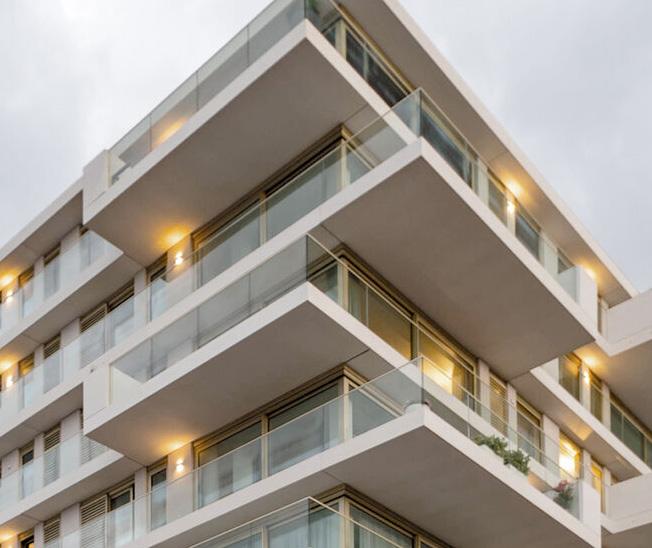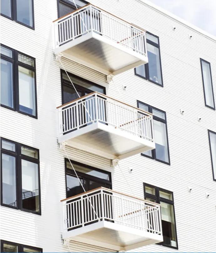 The use of high-performance balcony systems (such as exterior supported or thermally broken systems) can be used to limit thermal bridging potential.