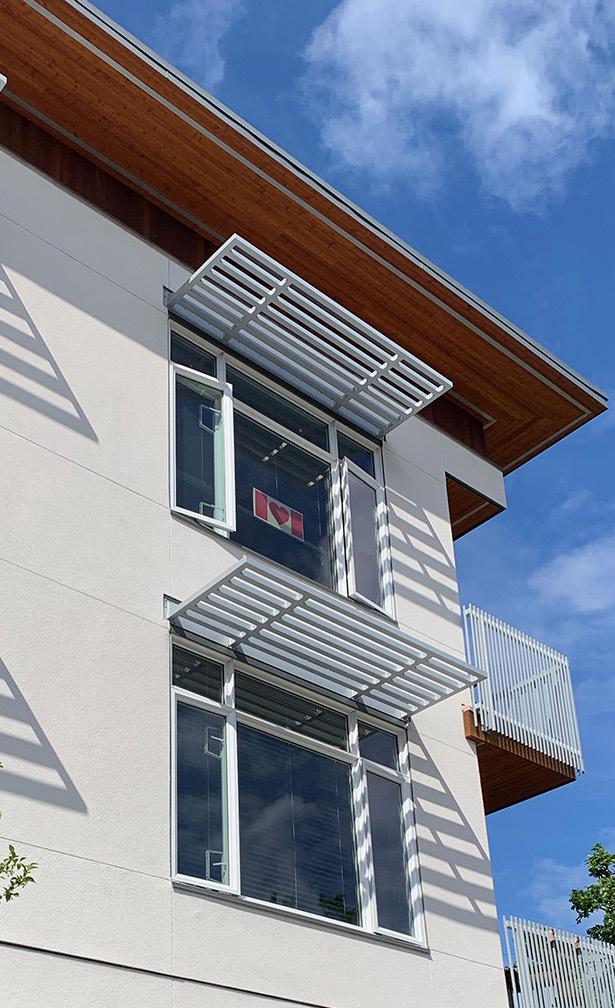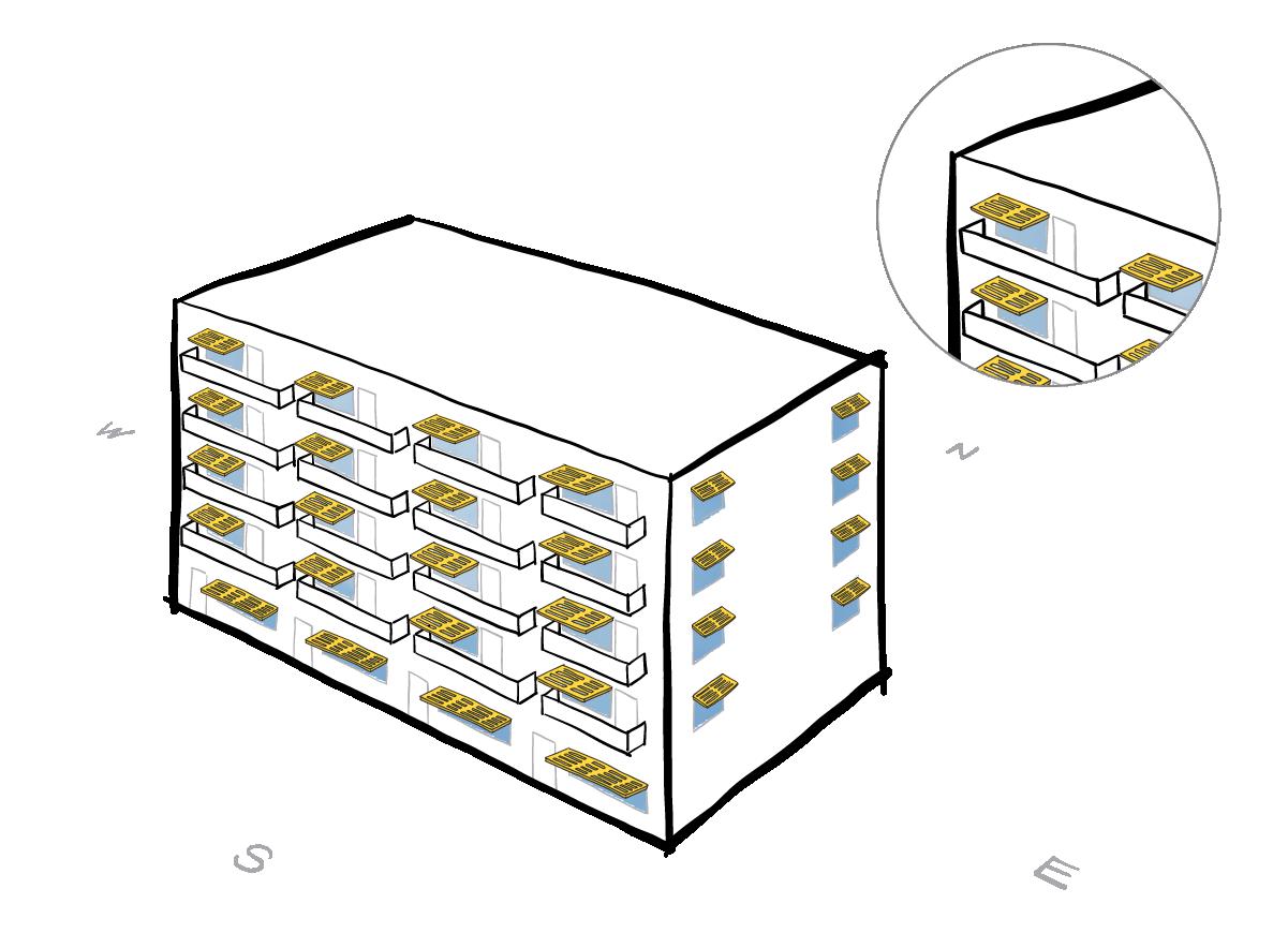 This mixed use project demonstrates effective use of horizontal shading devices on the southfacing facade, and a low overall WWR.