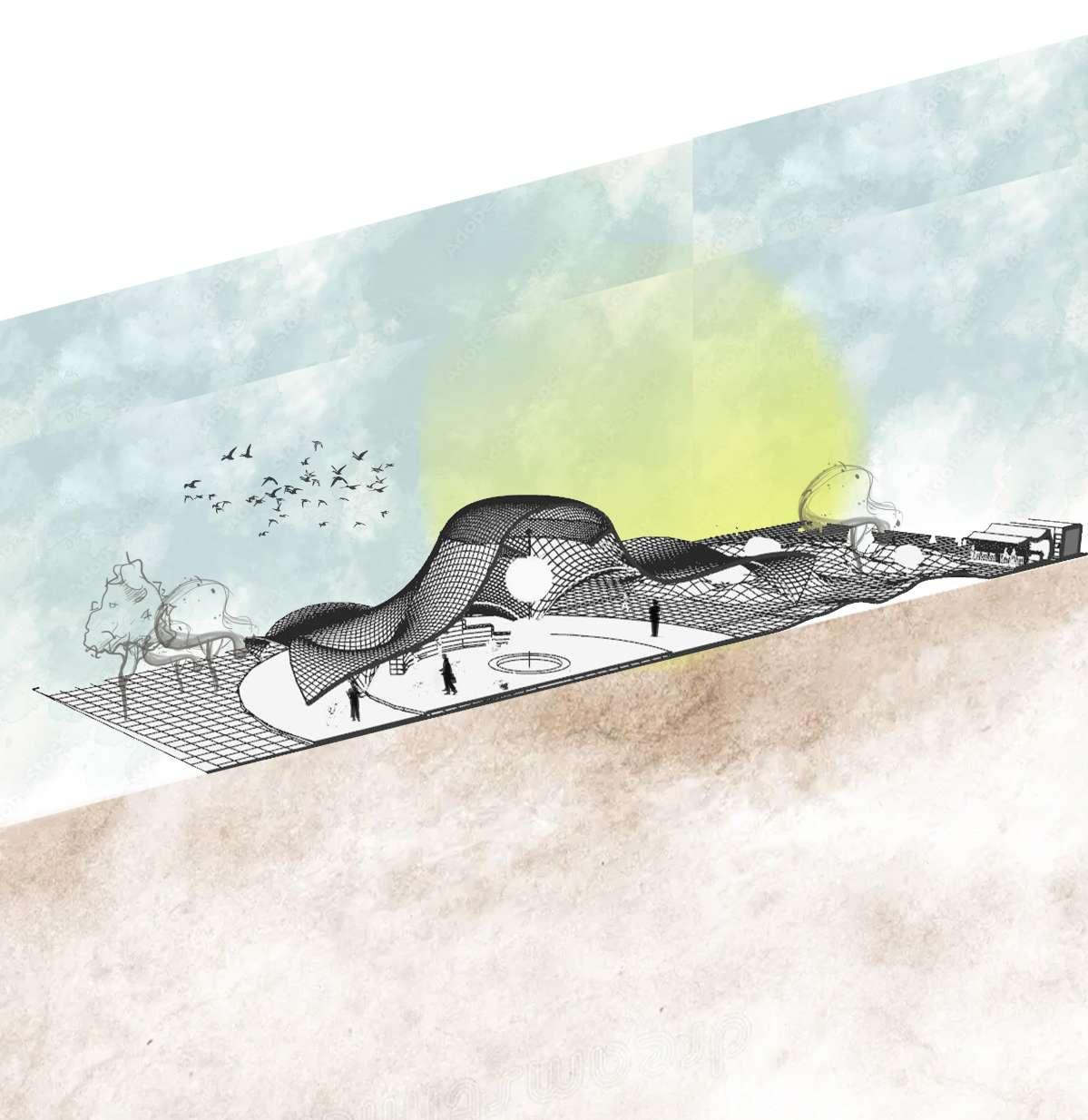 According to the concept, the form of the kiosk and mounded landscape inspired from the ocean waves and the pavilion roof structure is done on the Golden Ratio with the decreasing height of the each petal. The oculus at the centre, represents the earth. 1 2 3