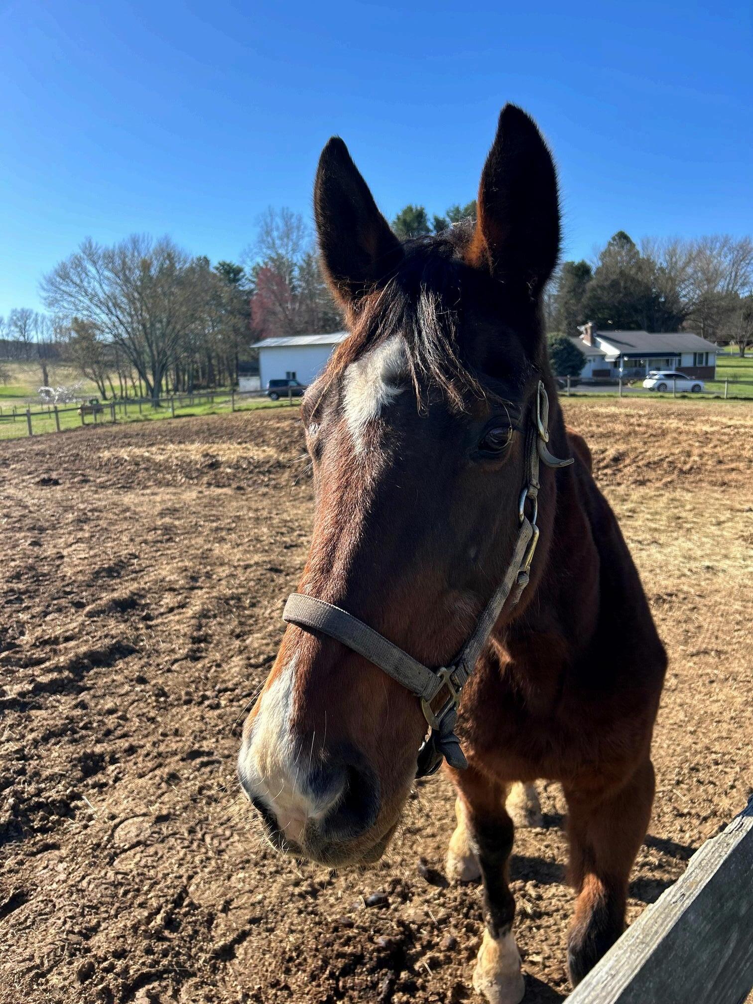 Mochi is a classic, distinguished looking young Thoroughbred gelding who enjoys the process of learning new things whether that is a new groundwork exercise or picking up a new trick. He is the happiest when he is hanging out with his people receiving words of affirmation, snuggles and scratches. Mochi was a part of large seizure in Jefferson County, WV in 2024. He was a body condition score of a 1… my what a glow up and transformation he went through both physically and mentally!