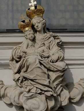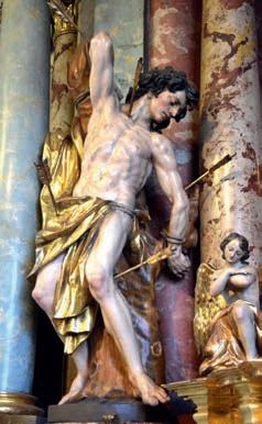 44 links Philipp Jakob Straub, Thronende Madonna mit Kind, Detail Hauptportal, Sandstein, 1742–1744, Graz, Mariahilferkirche, Foto: C. Pichler; Mitte Philipp Jakob Straub, hl. Sebastian, Detail Hochaltar, 1746, Graz, Welsche Kirche, Foto: C. Pichler; rechts Philipp Jakob Straub, Erzengel Michael, Holz, 1760–1770, Graz, Albrechtgasse Nr. 6, Fassade, Foto: C. Pichler