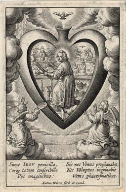 Kraichgauer Adeligen Damenstiftes), nach 1725, Öl auf Leinwand, 125,5 x 98,5 cm (mit Rahmen), Karlsruhe, Badisches Landesmuseum, Foto: Autorin; rechts Anton II. Wierix, Cor Iesu amanti sacrum, Das Jesuskind malt die Vier letzten Dinge in das Herz des Gläubigen, 1585–1586, Kupferstich, 9 x 5,7 cm, National Gallery of Victoria, Melbourne, Felton Bequest, 1923