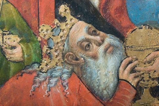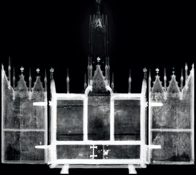 49 oben Marienzyklus, Epiphanie, Detail König Balthasar; Mitte von oben nach unten Detail des 3D-Modells; Röntgenaufnahme des Retabels; Reliquienretabel aus Schloss Tirol bei Meran um 1370, © Tiroler Landesmuseen