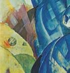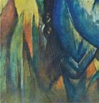 32 links Franz Marc, Der Turm der blauen Pferde, 1913, Öl auf Leinwand, 200 × 130 cm, Verbleib unbekannt, Fotograf unbekannt, Berlin, Staatliche Museen Preußischer Kulturbesitz, Zentralarchiv; rechts Blick in die Ausstellung „Entartete Kunst“, München 1937 (mit Der Turm der blauen Pferde von Franz Marc), Fotograf unbekannt, Berlin, Staatliche Museen Preußischer Kulturbesitz, Zentralarchiv