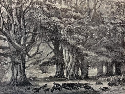 41 Kupferstich nach William Kümpel, Während der Buchenmast (Bratley Wood), 1875, mit dem Titel Bushy Brattley während der Buchenmast, aus: Illustrated London News, June 5, 1875, 533