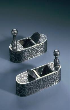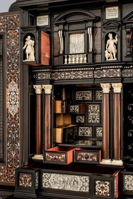 47 oben Kabinettschrank, sog. Großer Schi ersteinschrank, Hans Schi erstein, Dresden 1615, Kunstgewerbemuseum, SKD, Inv.-Nr. 47708, Foto: SKD, Rüstkammer, Jürgen Lösel, unten von links zwei Hobel, wohl Nürnberg, um 1570, Rüstkammer, SKD, Inv.-Nrn. P 0246, P 0247, Foto: DSKD, Rüstkammer, Jürgen Karpinski; langer Bohrer („Band-Neber“), wohl Matthias Schwerdtfeger, Nürnberg, um 1560–1570, Rüstkammer, SKD, Inv.-Nr. P 0234, Foto: SKD, Rüstkammer, Jürgen Karpinski; Spielstein mit dem Porträt des Kurfürsten August, Deutschland, 1590/1591, Wachsbossierarbeit: Heinrich Rappusch d. Ä., Berlin, Rüstkammer, SKD, Inv.-Nr. P 0132, Foto: SKD, Rüstkammer, Jürgen Lösel; Rapier mit Uhr im Knauf, Uhrmeisterpunze: TR, wohl Dresden, um 1610, Rüstkammer, SKD, Inv.-Nr. VI 0434, Foto: SKD, Rüstkammer, Jürgen Lösel