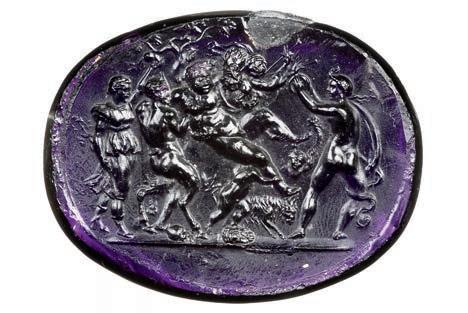 57 Glaspasten des Martin von Wagner Museums der Universität Würzburg Kat. 1014A und 958, links Intaglio, Positivabdruck, Triumph des Silen, Original: Heliotrop, Paris, Cabinet des Médailles, aus Slg. Rascas de Bagarris (1562–1620), Louis XIV; rechts Kameo, Phokion, von Alessandro Cesati, um 1540, Original verschollen, frühere Besitzer: Antonio Maria Castiglioni, zu Cingoli, Kardinal Alessandro Albani, Rom. Foto: Christina Kiefer
