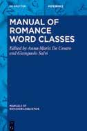 The goal of the Manual of Romance Word Classes is to offer a comprehensive up-todate discussion on all the relevant aspects related to word classes in the Romance languages, considering both the standard, major Romance languages (French, Spanish, Italian, Portuguese, Catalan, and Romanian), and smaller, lesser described Romance(-based) varieties (Occitan, Sardinian, Romansh, Ladin as well as Italian dialects and Romancebased creoles).
