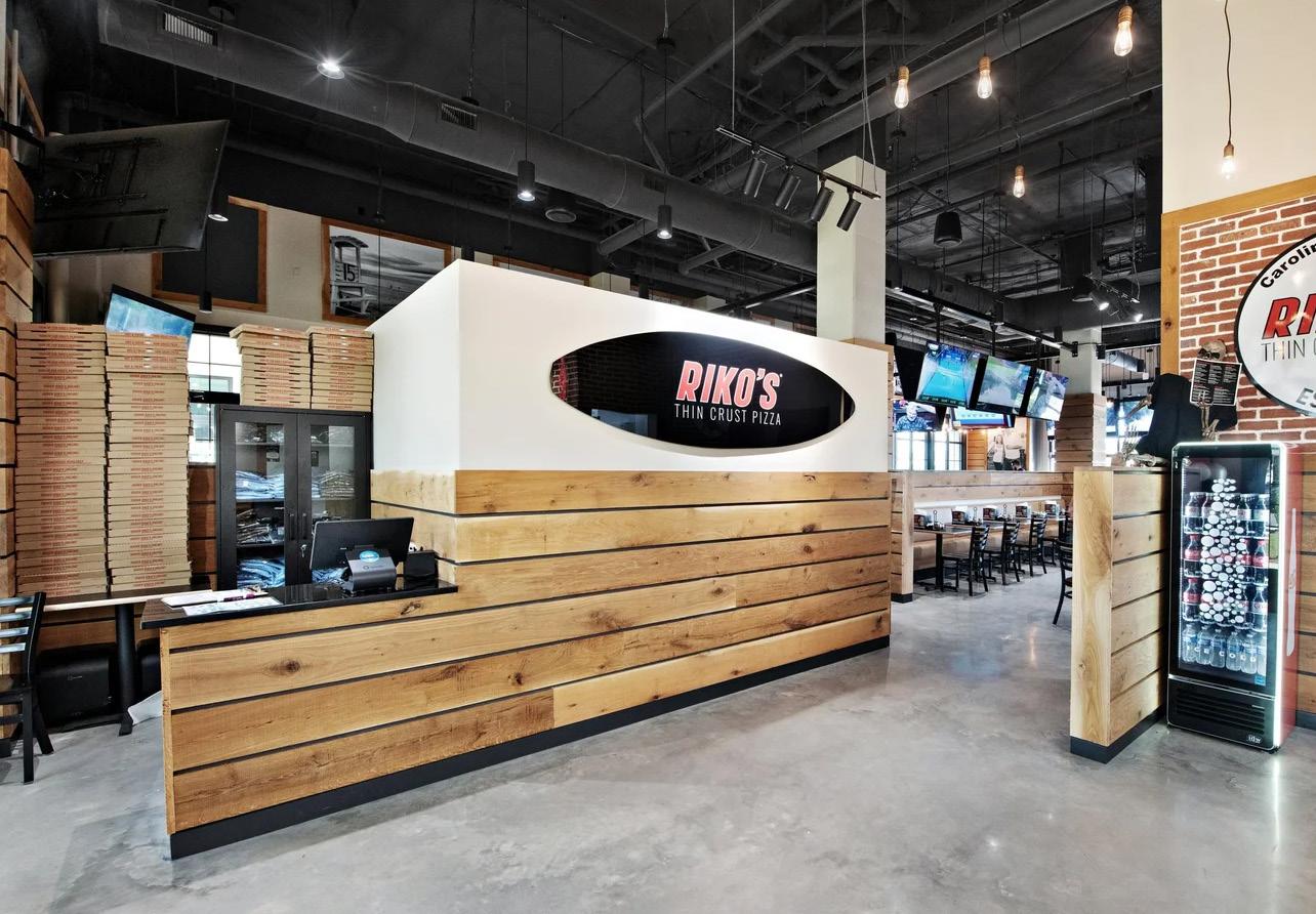 Riko’s Pizza Carolina Beach location is the first of it’s kind. Bringing the brand from the northeast to coastal North Carolina, the brand’s interior designer allowed creative input into making this location feel like it belonged in Carolina Beach. To do this, we incorporated custom millwork provided by a local company, vintage photography of Carolina Beach, and subtle beach motifs throughout. This project included a custom bar, TV mounts, and spatial planning that would work best for the beach crowd.
