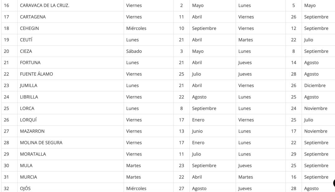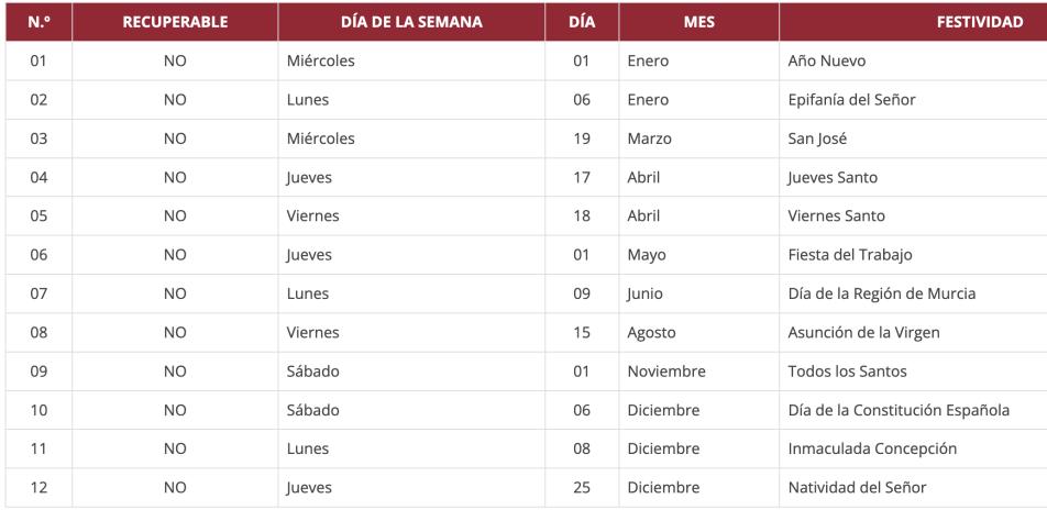 Los días inhábiles a efectos laborales en todo el ámbito del territorio de la Región de Murcia para el año 2025,nocoincidentescondomingo,seránlosdíasqueseindicanacontinuación: