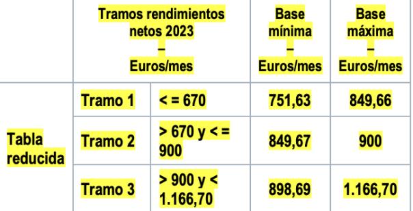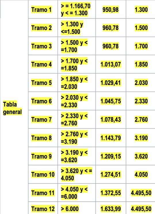 Durante el año 2023, la tabla general y la tabla reducida, y las bases máximas y mínimas aplicables a los diferentes tramos de rendimientos netos, serán las siguientes: