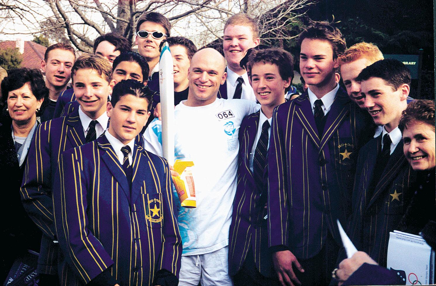 Mrs Genie Scott Alumni Officer Damian Brown poses with students after running with the torchIt was a most thoughtful Jubilee Year gesture from College Headmaster Br Tim Peter to invite Old Collegian Priests and Brothers back to their Alma Mater for a celebratory Eucharist and Dinner, held at the Brothers’ Malvern residence on Friday, 28th April 2000.