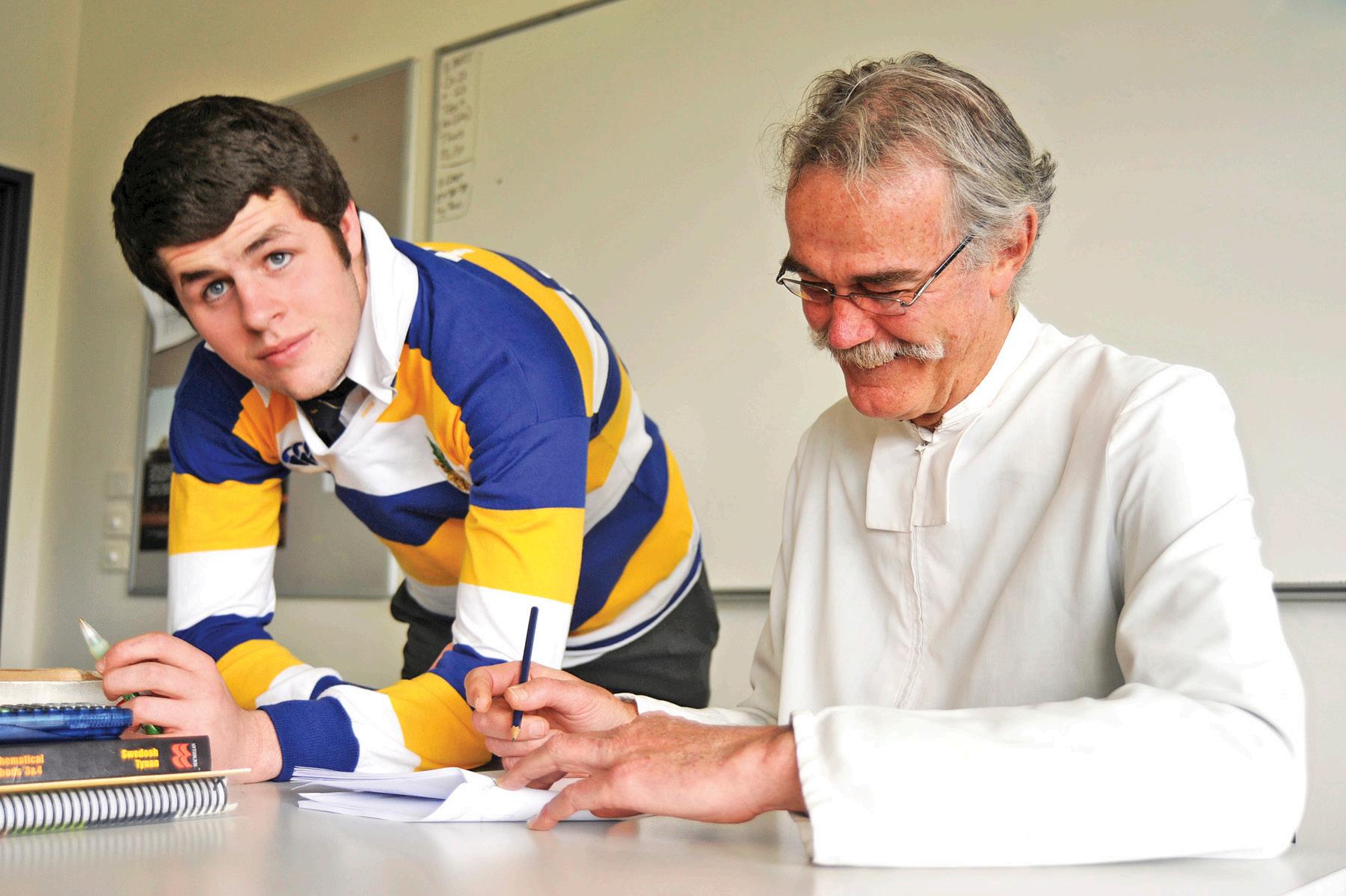 Br Denis in his Maths class at Kinnoull Campus with 2009 VCE student, Dan East