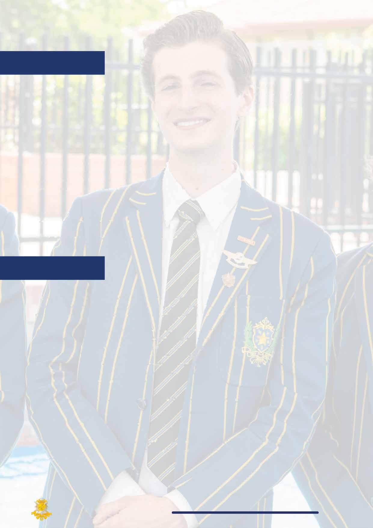 White, long sleeve shirt. It is always to be worn with the College tie and tucked in. Trousers must not be excessively baggy or oversized and should be worn with a black belt. Navy blue monogrammed pullover. The College jumper may be worn in winter or summer however it is not to be worn as an outer garment.