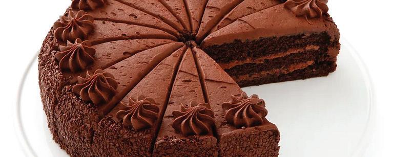 TRIPLE CHOCOLATE CAKE – 3 lb chocolate cake cut into 3 layers. Filled and iced with chocolate icing. Sided with dark Paillete Fins and dolloped with chocolate icing. #1005633 – 2 / 16 slice