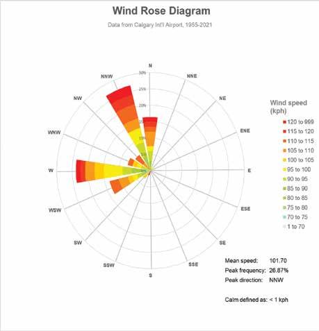 Alta. The green line indicates wind direction and the typical directions for strong winds in Calgary come from the west to north as the mechanism for these winds tends to be chinooks or otherwise known as down-slope winds. An extreme value statistical model can be readily developed to predict the combined probabilities of wind speed and direction. For some projects, utilizing this detailed information for the