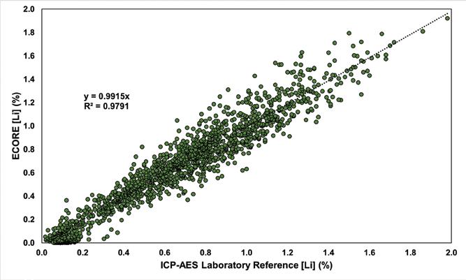 discrimination of minerals that are similar in composition. This can be seen in f igure 3, where using R gB mapping, spodumene, and petalite are easily distinguished from one another within the same core sample. feature mapping like this has proven to be very useful not only for distinguishing between mineral phases but also for highlighting compositional variations within the same mineral. ECORE technology also has the added benefit of providing predicted and true chemical assays in real time, eliminating the weeks or months of delay that is typically associated with waiting for traditional laboratory assay. f igure 4 shows chemical assays taken at one-metre intervals over 1,500 metres of drill core from a lithium pegmatite deposit compared to assays obtained by a standard laboratory method (ICP-AES, four acids). The R² value (0.98) and the slope of the curve (0.99) show a very strong correlation between these two methods, demonstrating that ECORE is as effective and reliable as traditional laboratory methods.