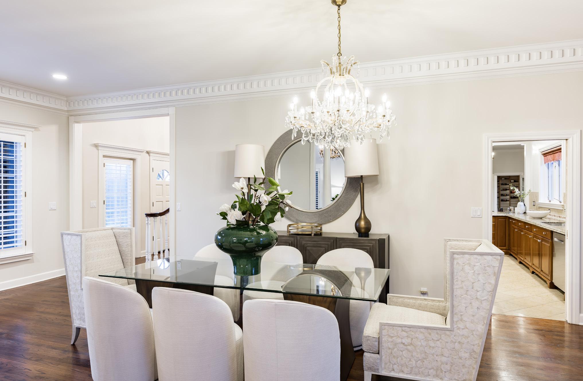 • Formal dining room with crystal chandelier and glass door opening to back patio