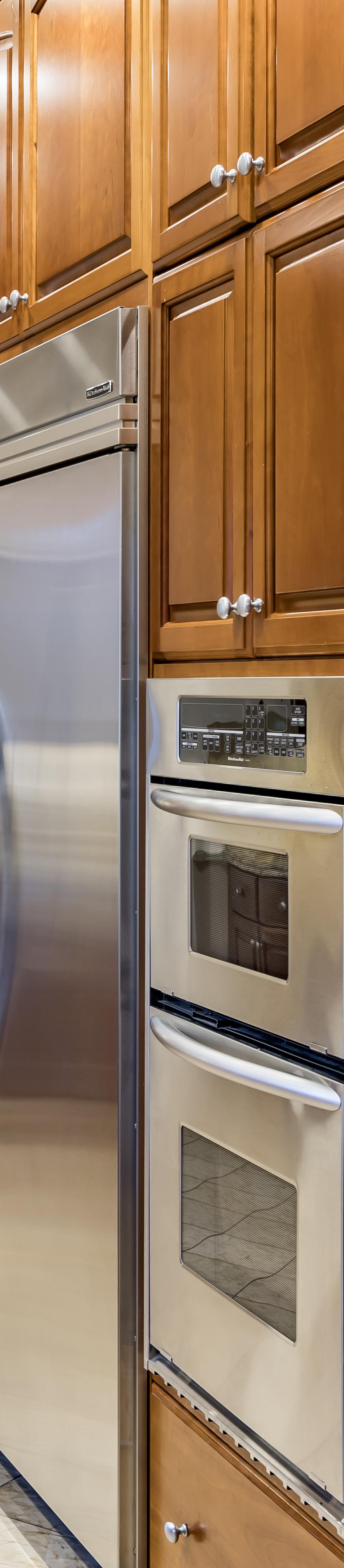• Chef’s kitchen features granite countertops, dualbasin sink, Bosch dishwasher, and KitchenAid refrigerator, ovens, and 6-burner range