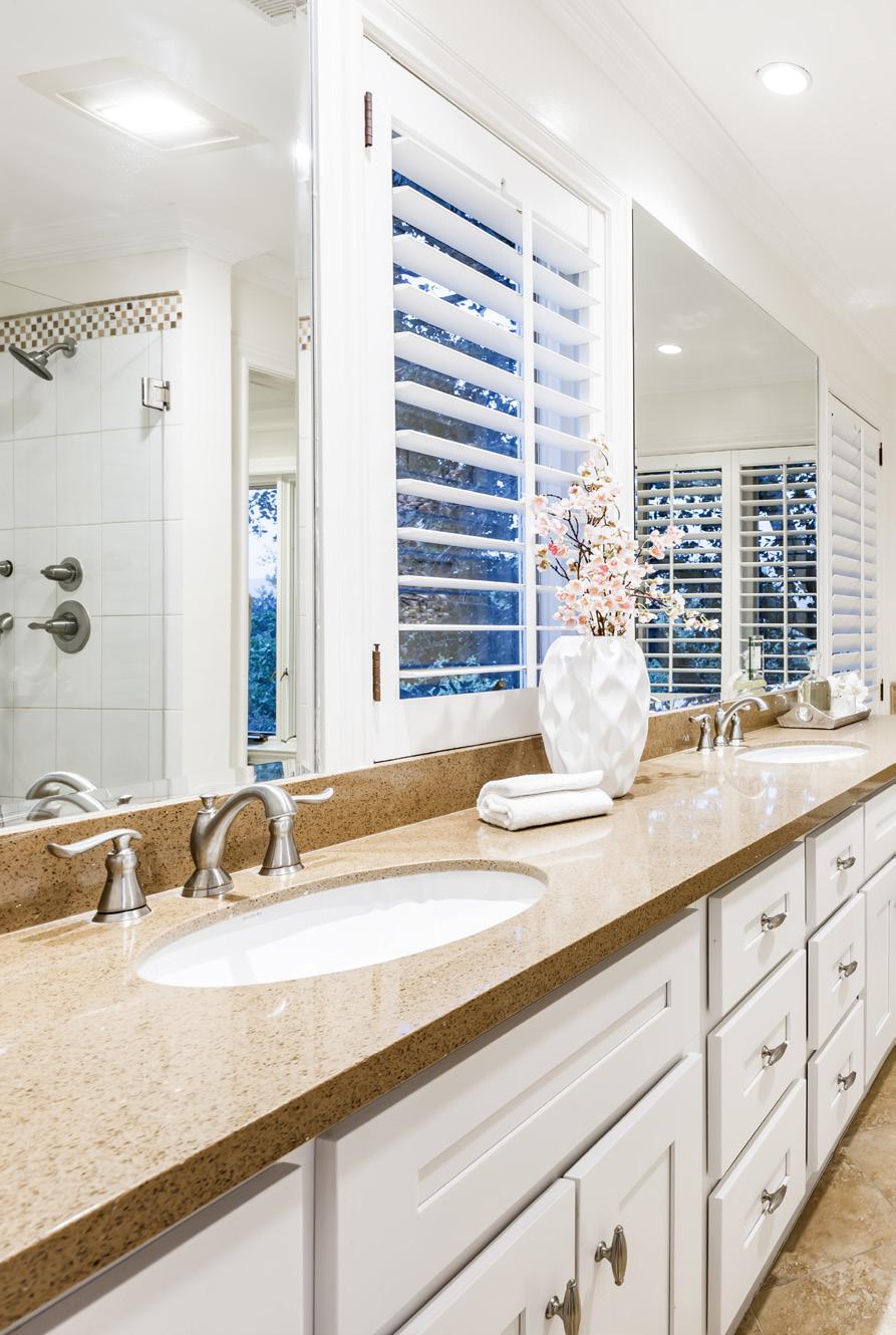 • Two bedrooms upstairs with shared access to bathroom featuring dual vanities, jetted tub, and shower
