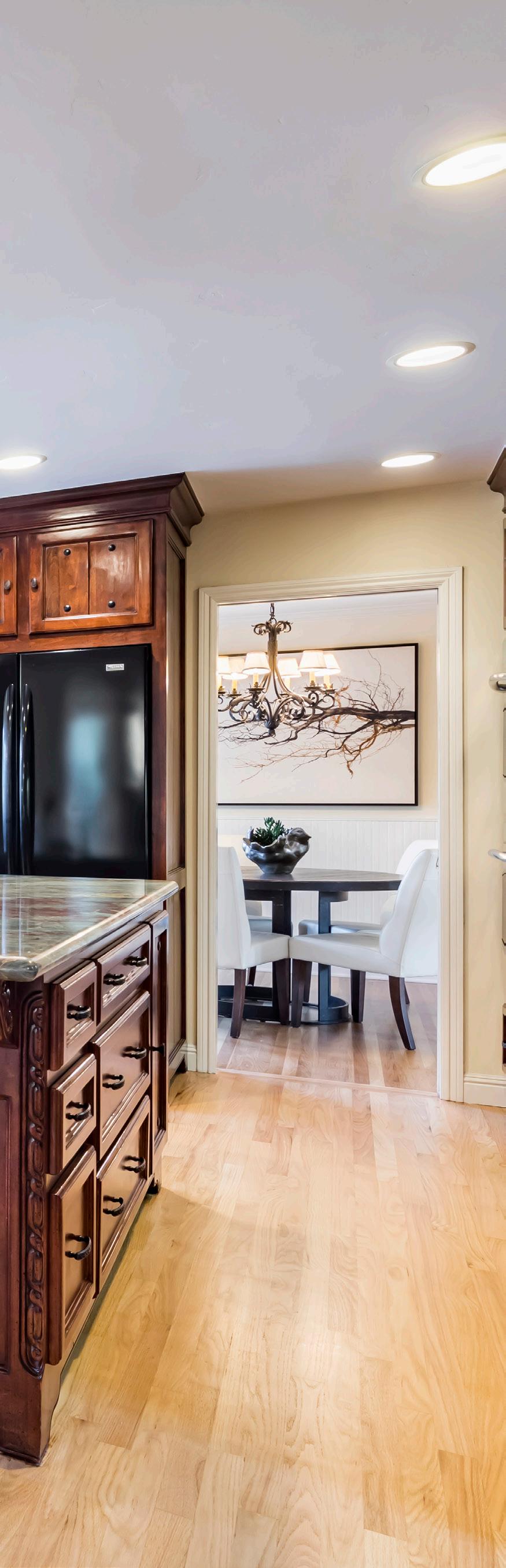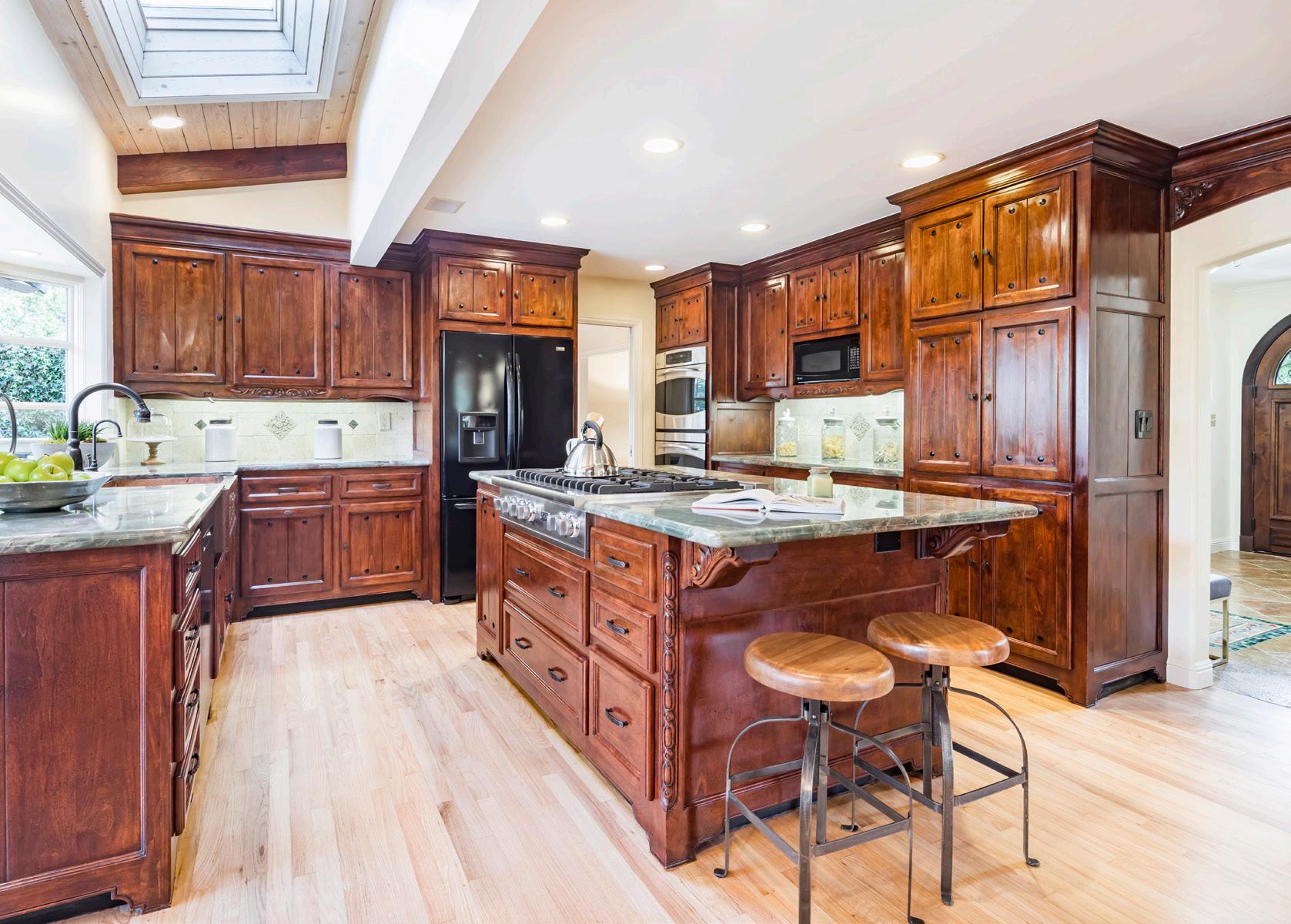 • Featuring stunning, hand-carved, custom alder cabinetry, the granite-appointed chef’s kitchen includes an island, high-end appliances including a Viking stove, a copper sink, plus a sunny eat-in area with backyard access