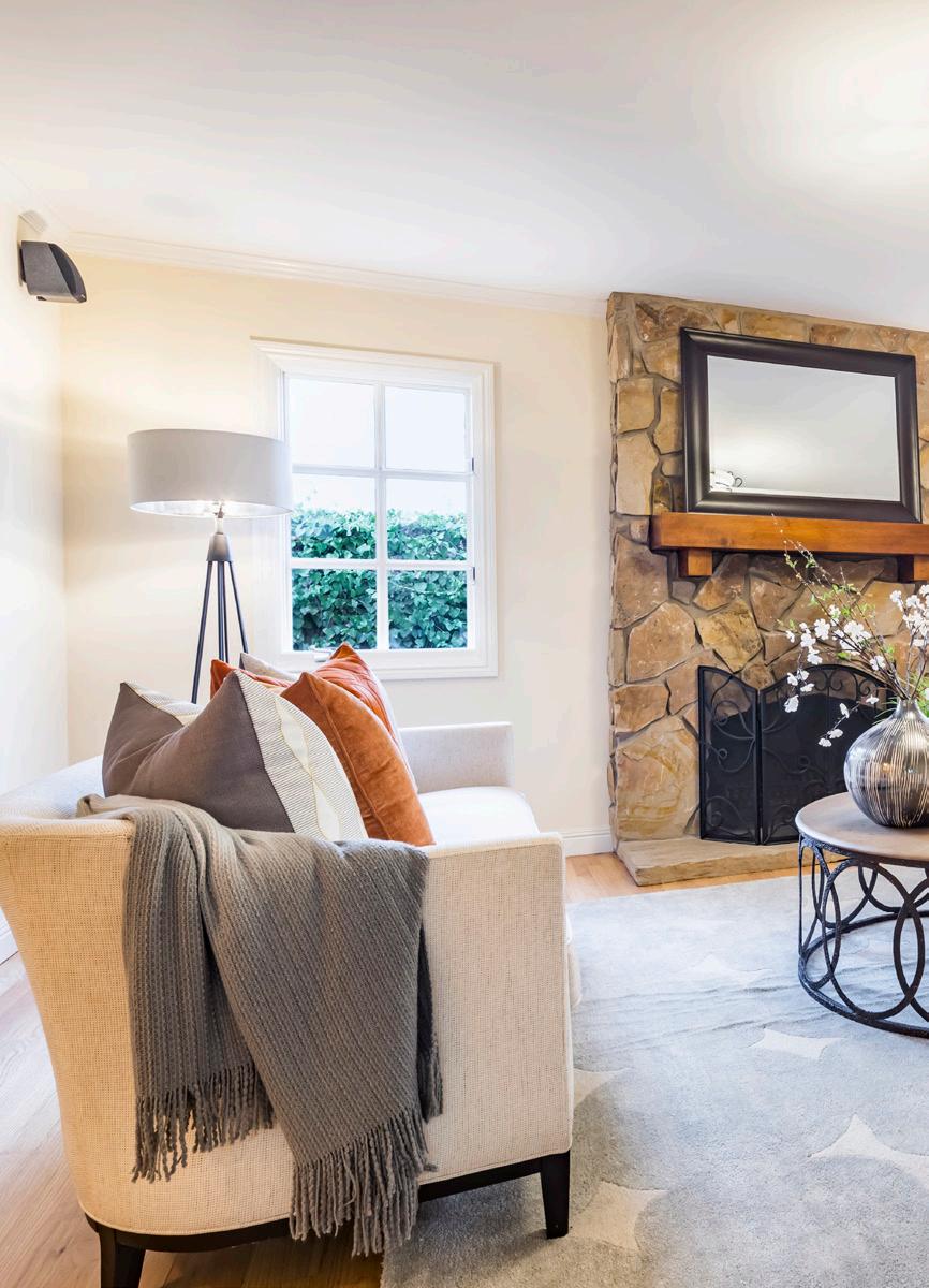 • A fireplace adorned in floor-to-ceiling stone centers the family room, which leads into nearby office space with custom built-ins