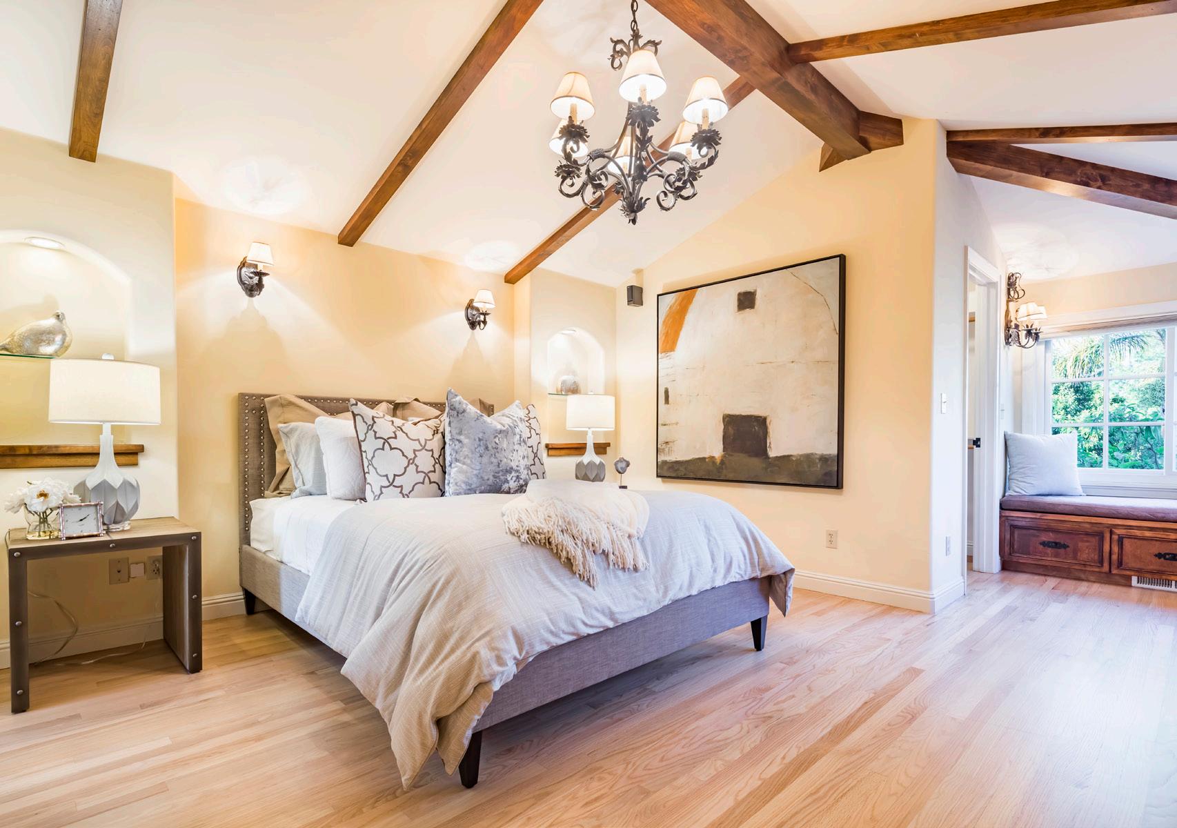 • Beneath a beamed ceiling, the romantic master suite includes an instant-on gas fireplace, a built-in custom cabinet, as well as a walk-in closet, plus an en suite bathroom with a dual-sink vanity, oversized walk-in shower, and soaking tub