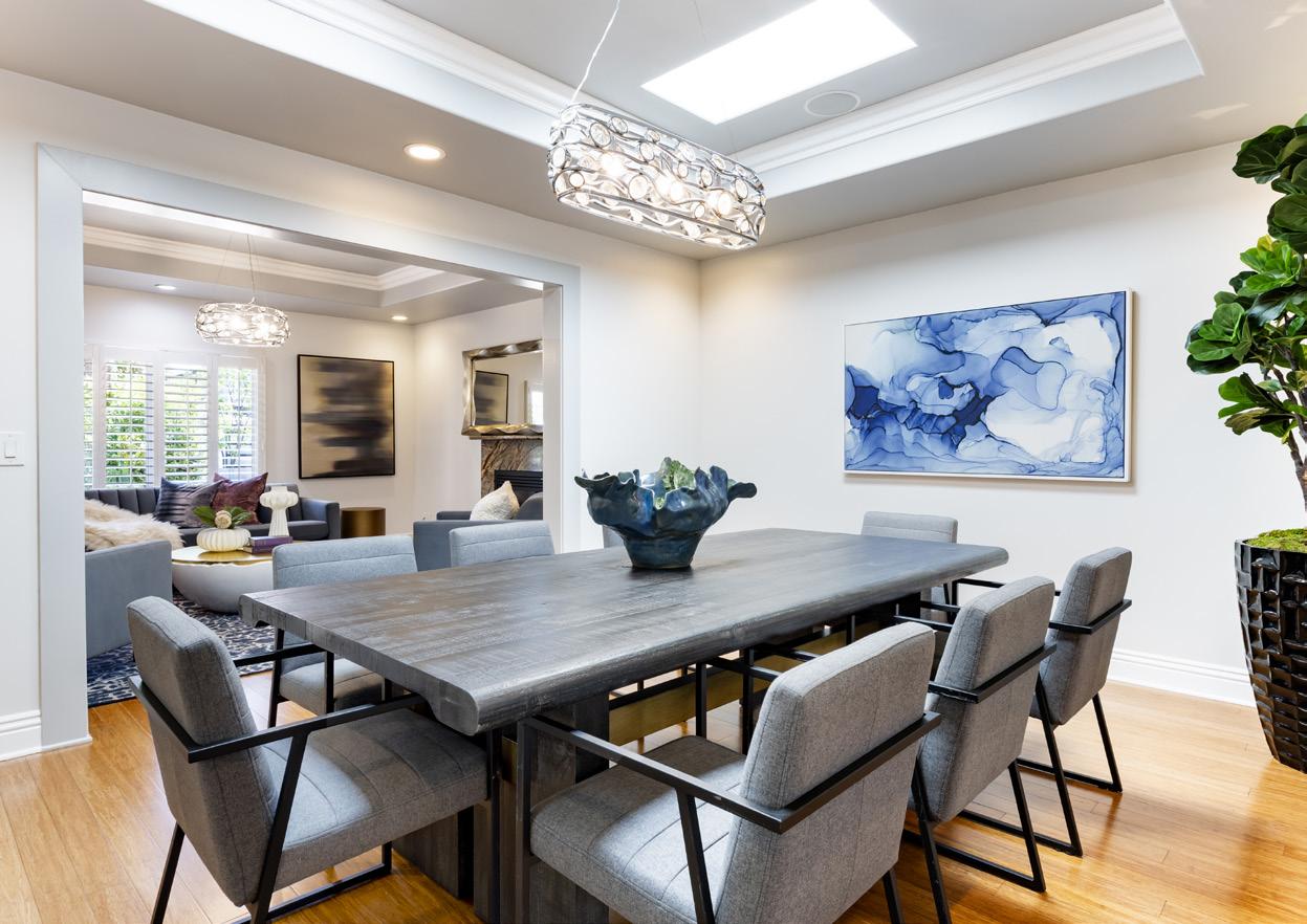 • A fireplace centers the living room, which opens to the expansive dining room with two skylights
