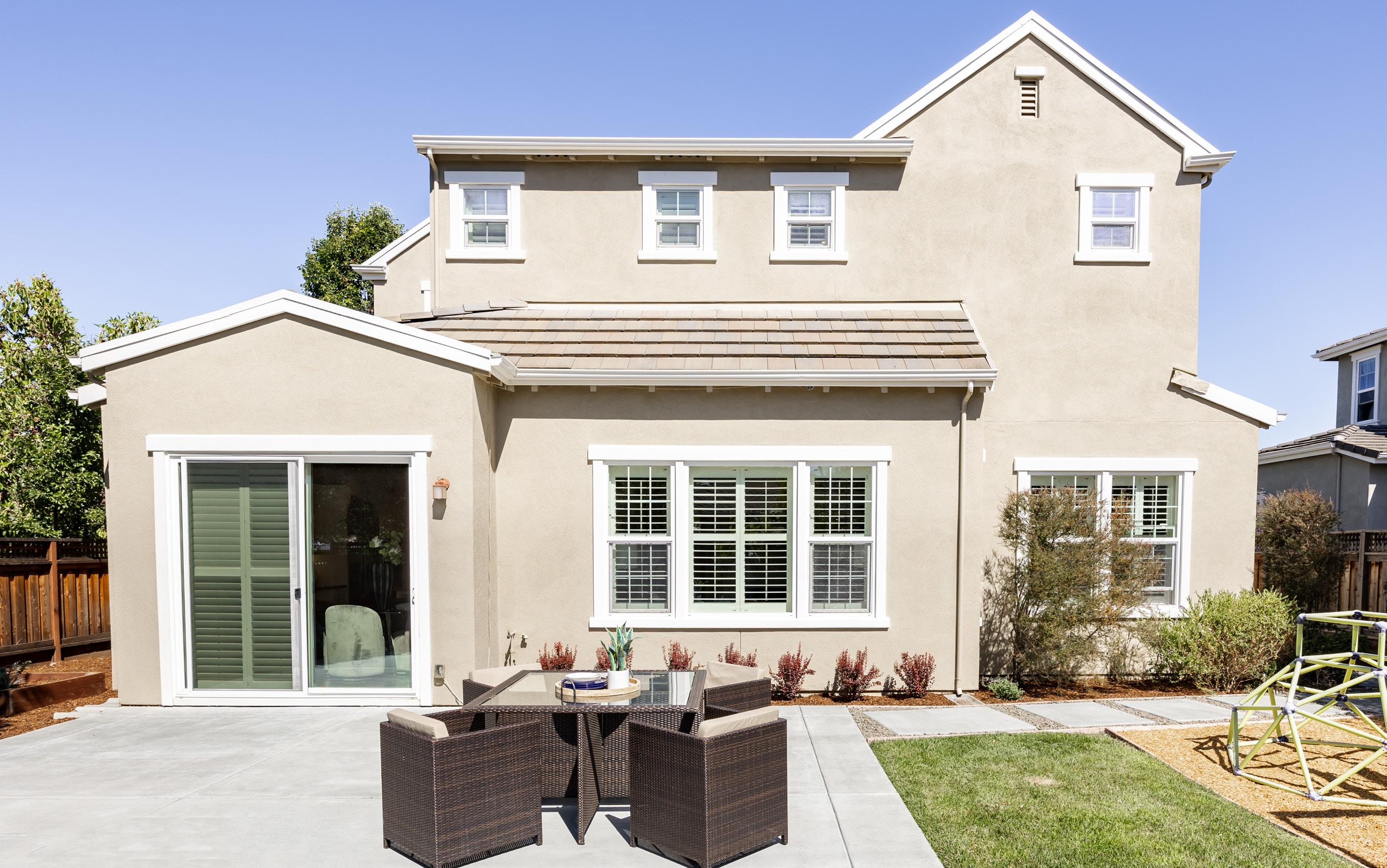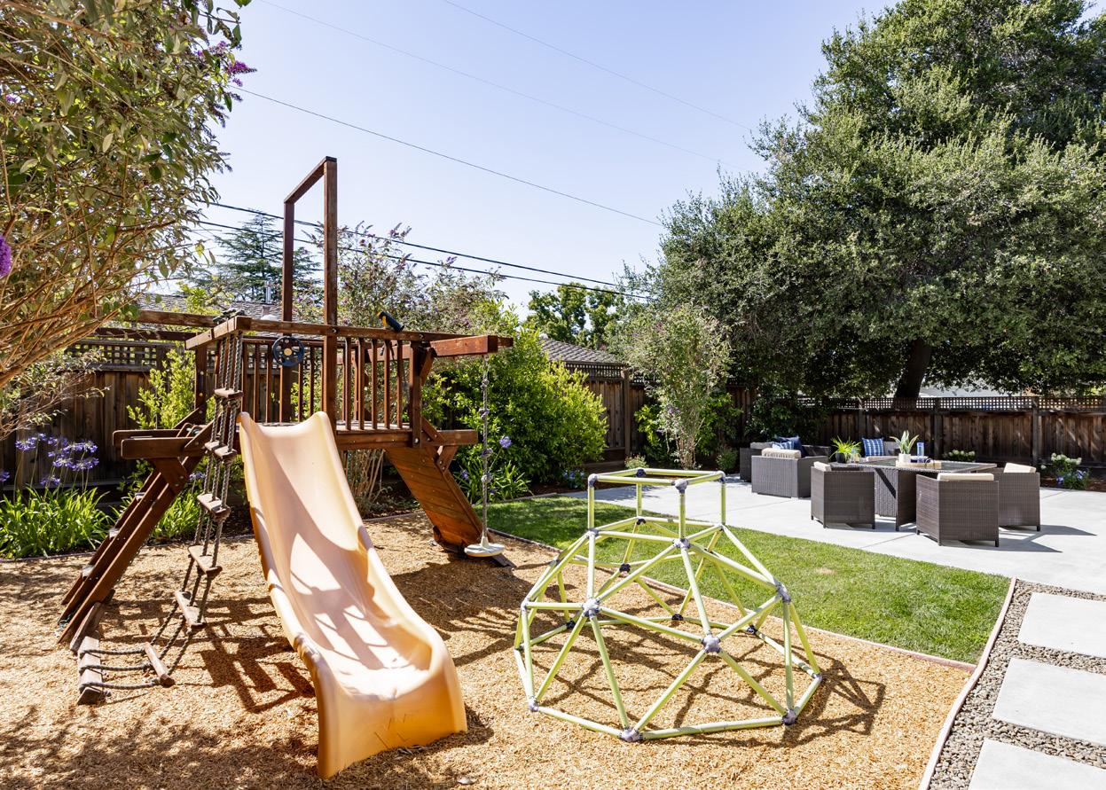 • Peaceful, private backyard with large patio, lawn, play structure, and planter boxes