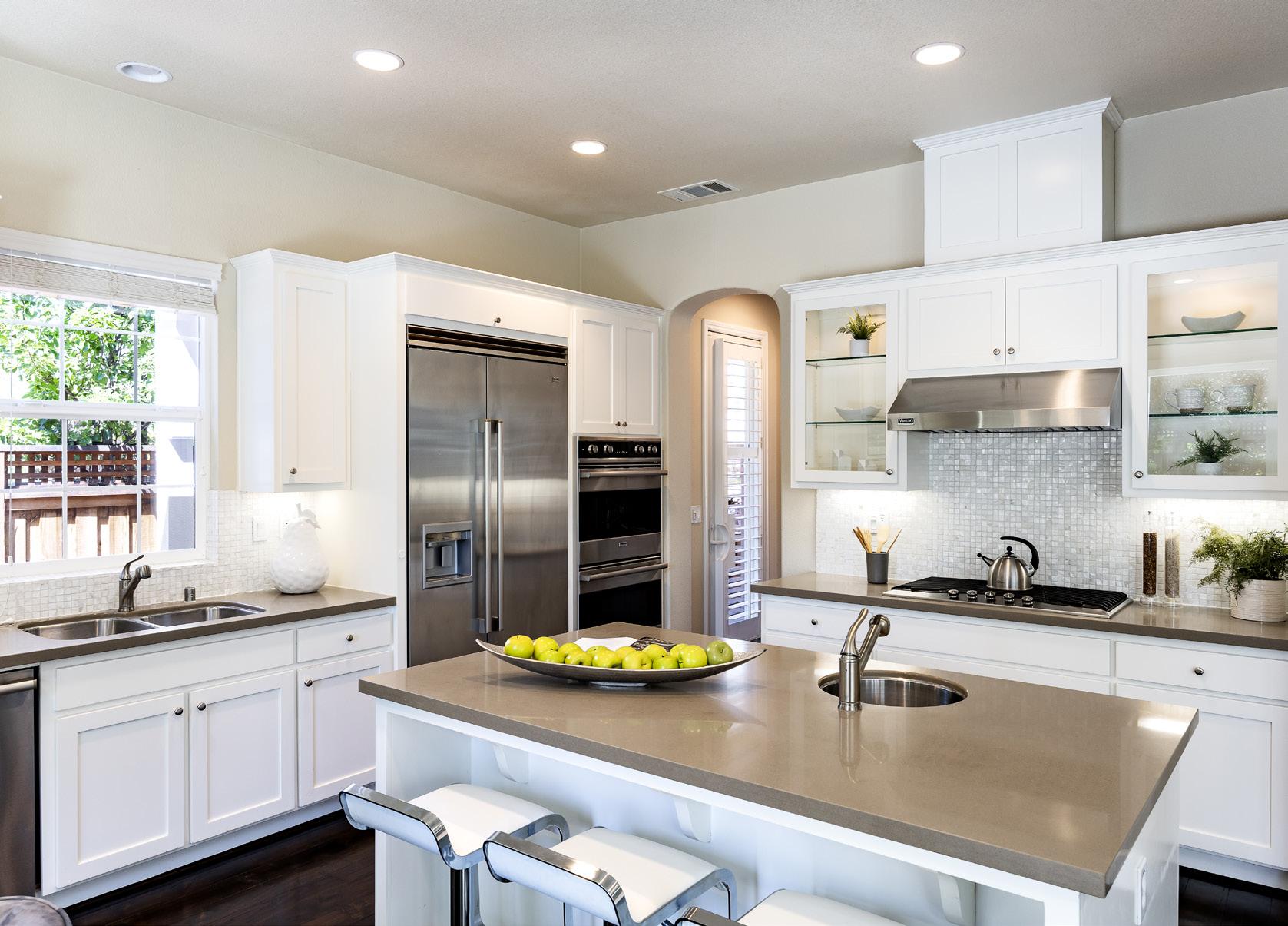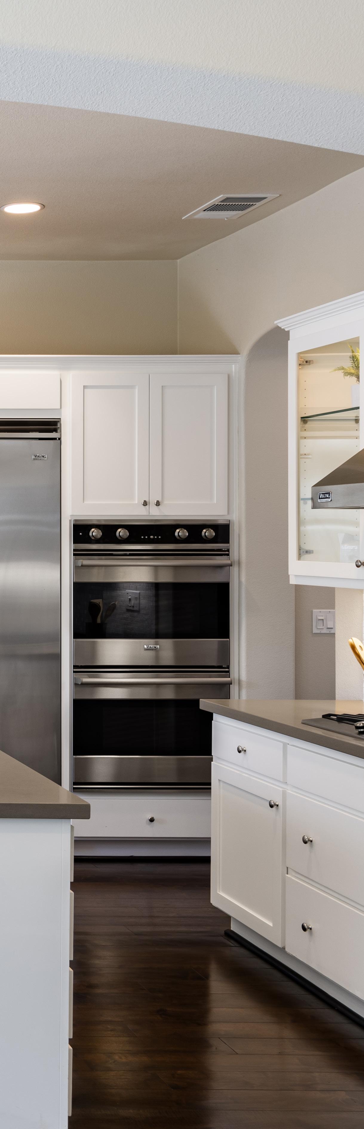 • Chef’s kitchen with quartz countertops, tile backsplash, island with prep sink, and suite of Viking appliances