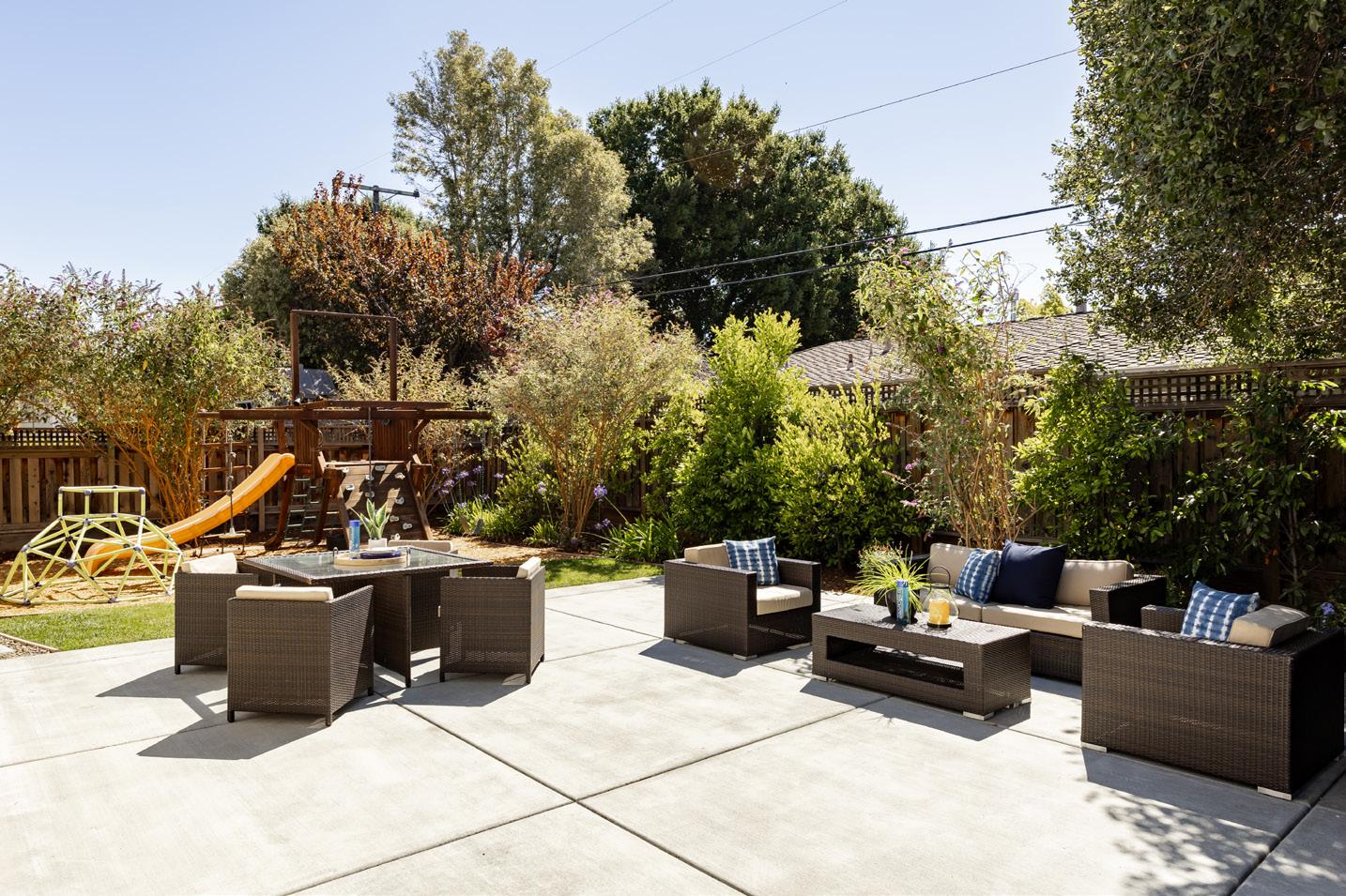 • Peaceful, private backyard with large patio, lawn, play structure, and planter boxes