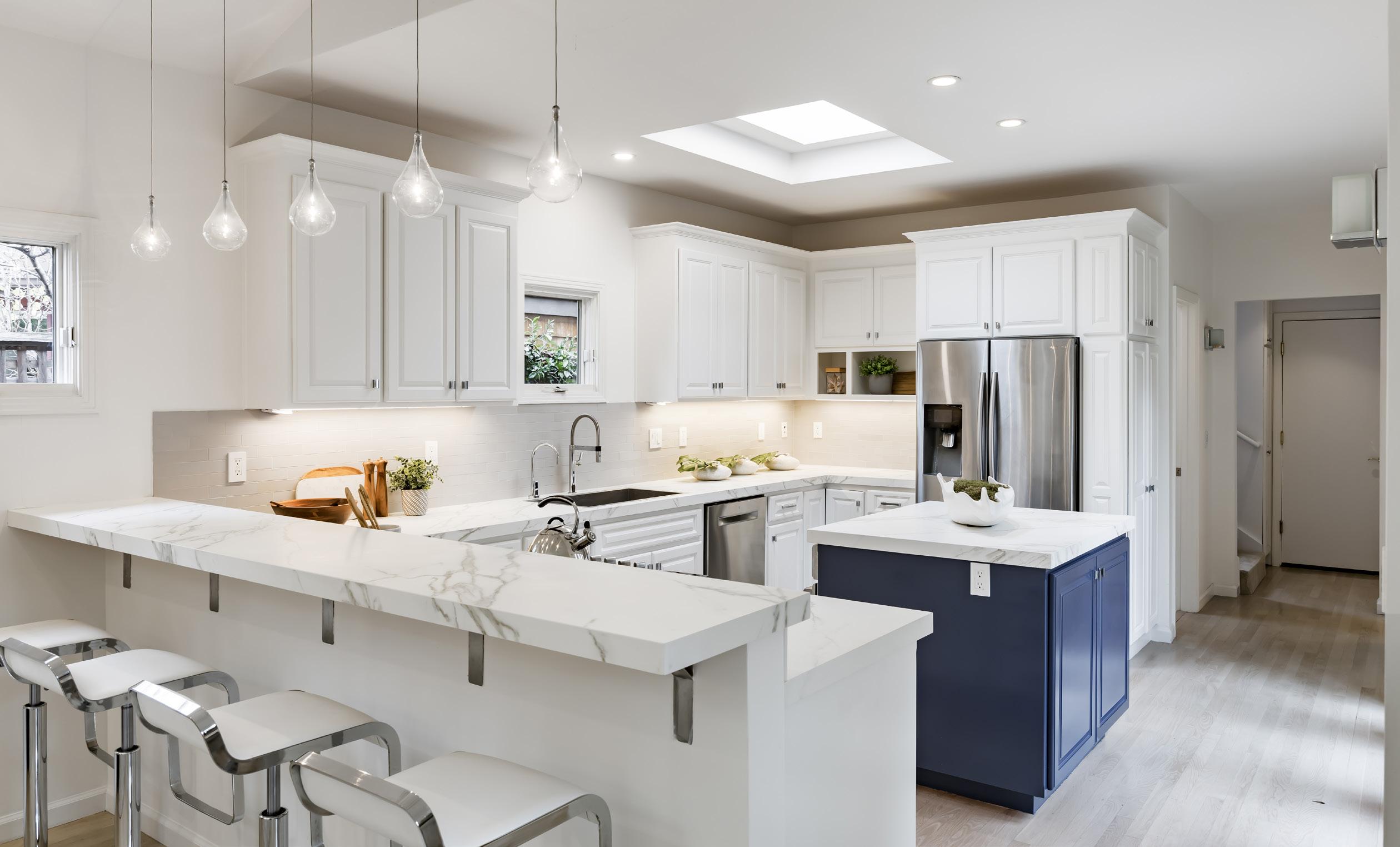 • Chef’s kitchen with quartz countertops and subway tile backsplash; ample cabinetry, center island, breakfast bar seating space, French doors to backyard