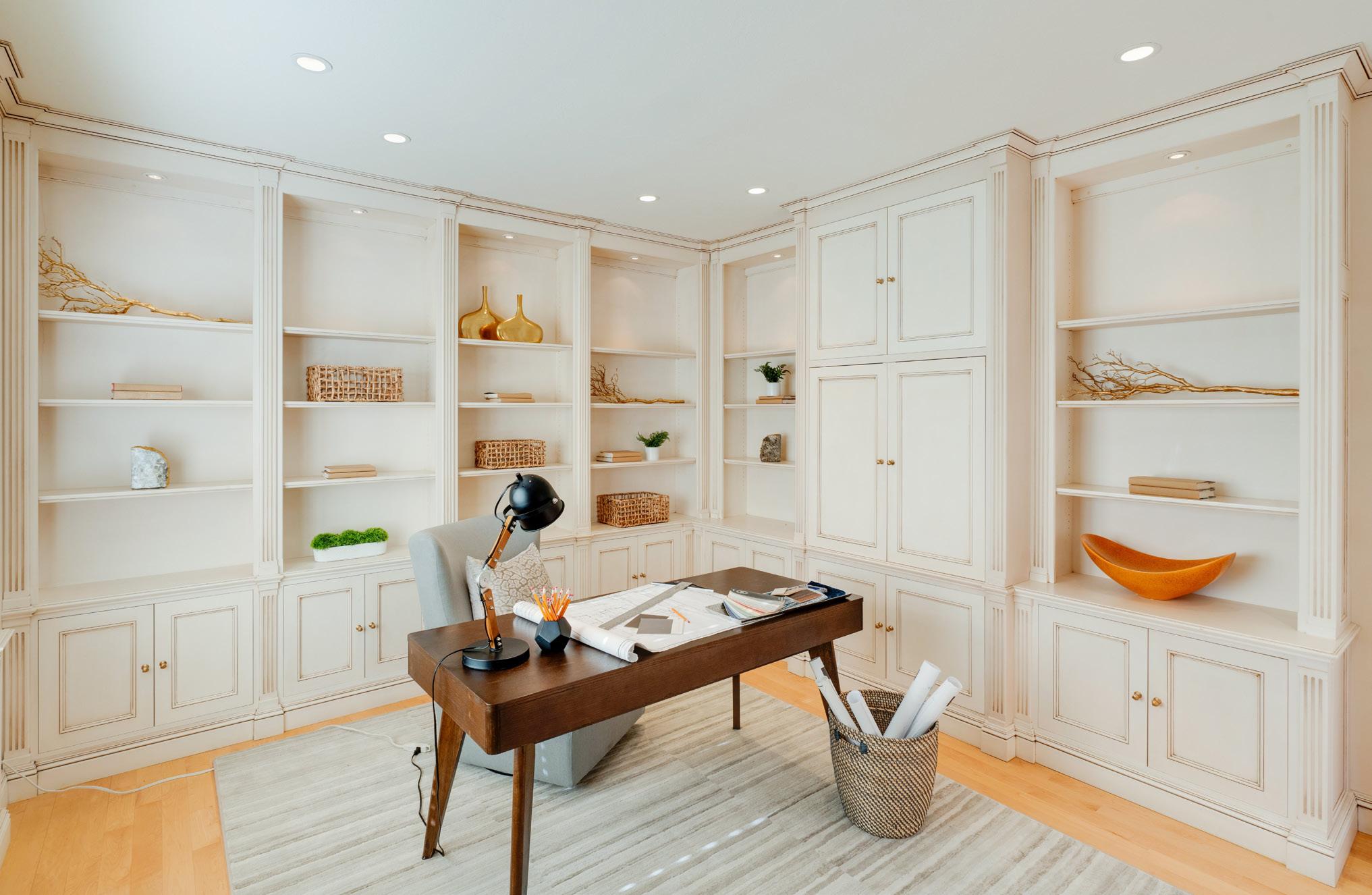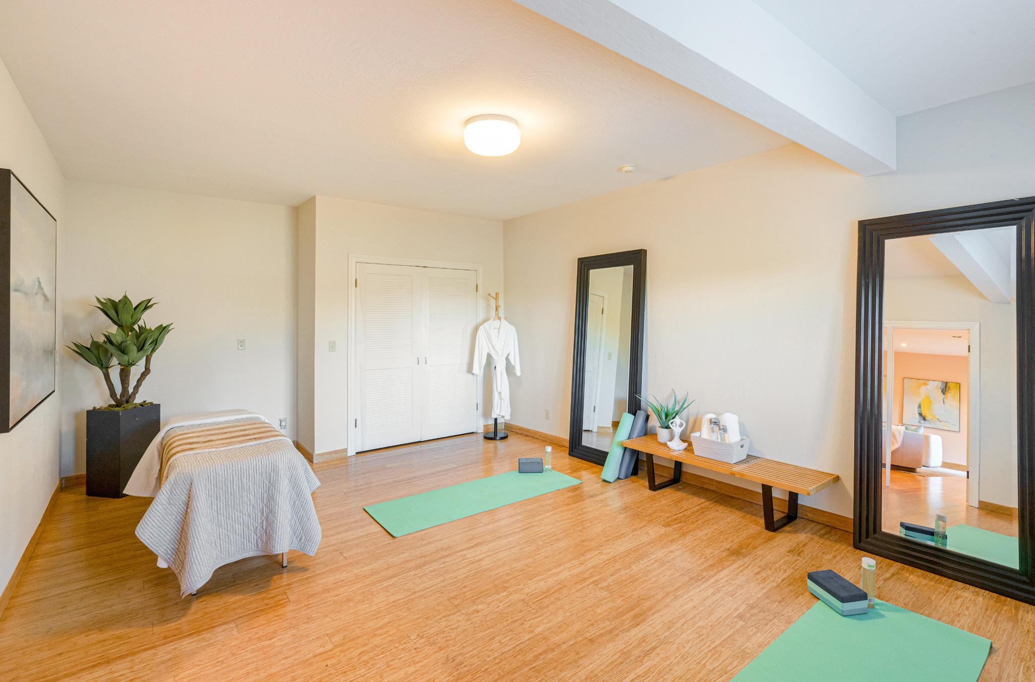 • Downstairs, a recreation room opens to the grounds and is served by a wet bar with a sink and refrigerator drawers, while a flexible-use room can be used as an office or additional accommodations
