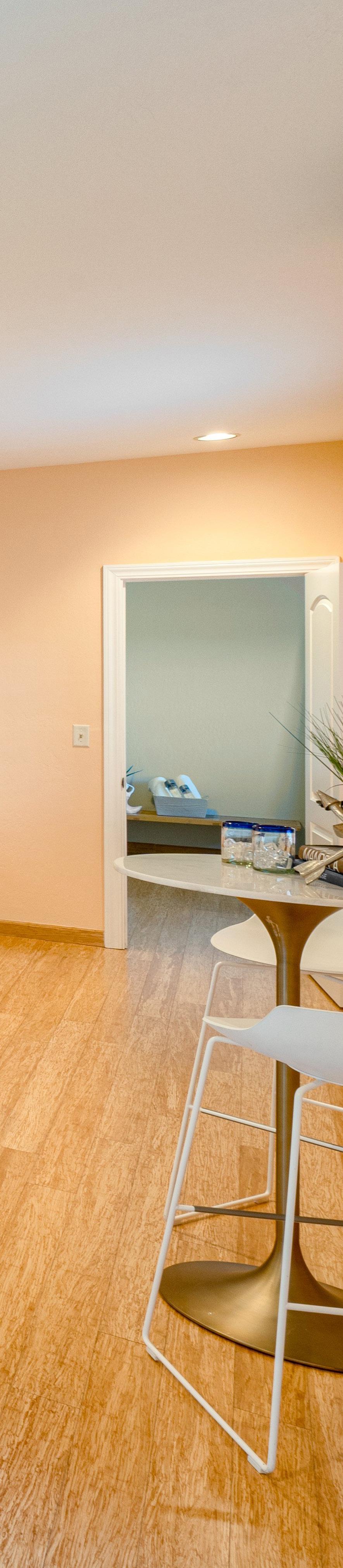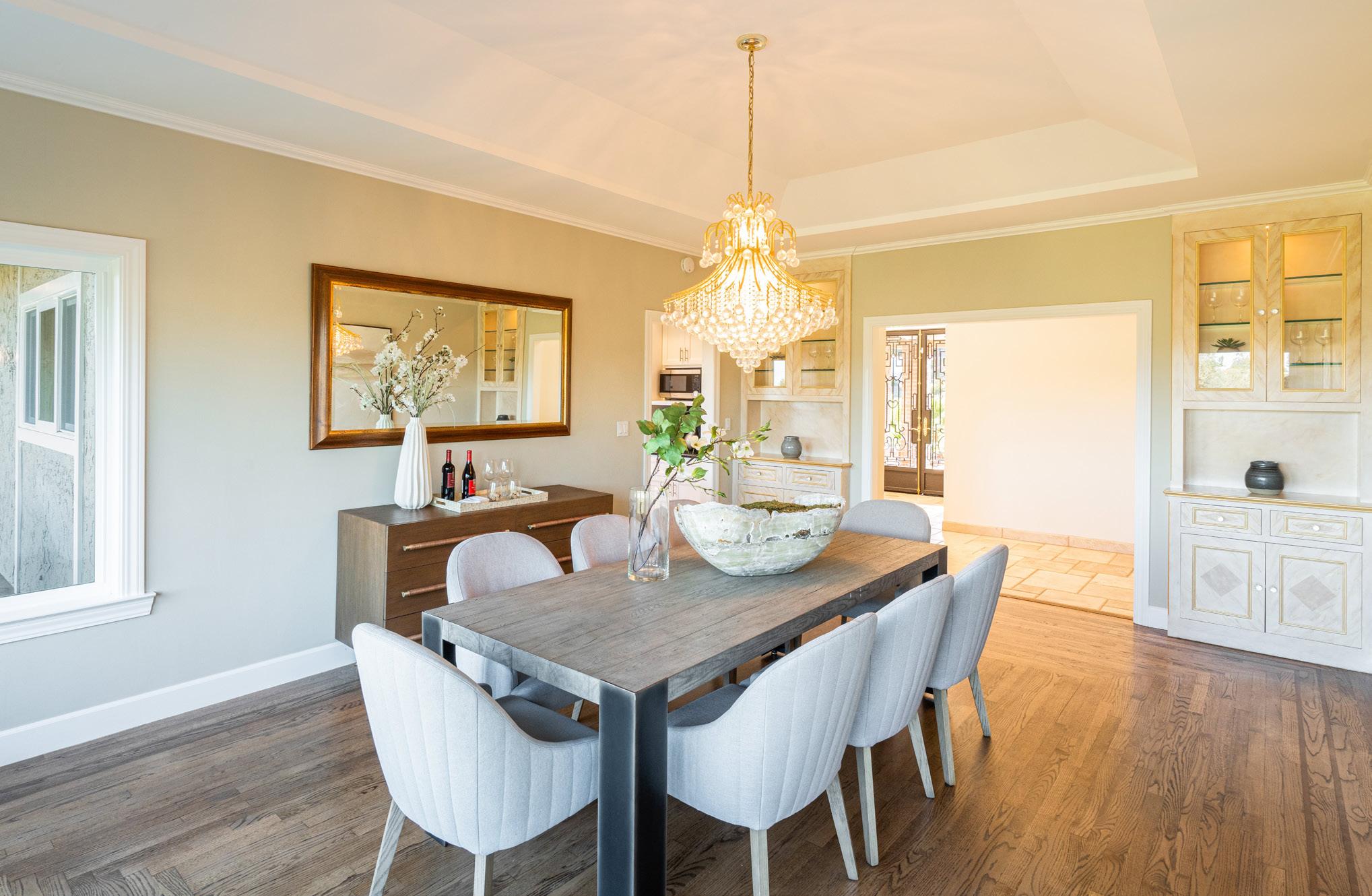 • Beautiful hardwood floors extend throughout expansive gathering spaces, beginning in the living room with a fireplace in floor-to-ceiling tile, and continuing into the dining room with a glittering chandelier
