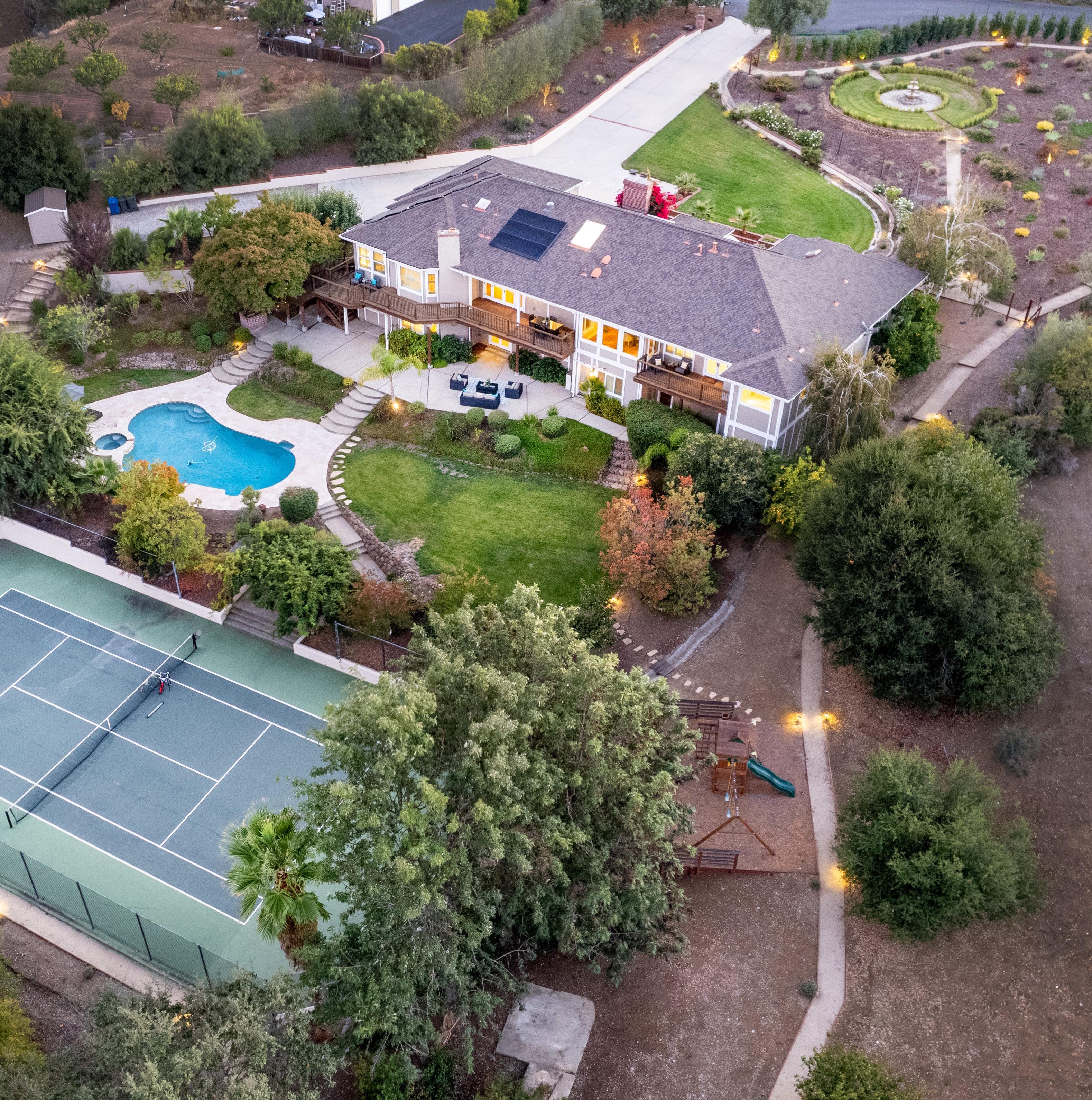 • Five-star grounds feature cascading terraces and include a free-form pool and spa, ample patio space, a level lawn, play structure, and tennis court