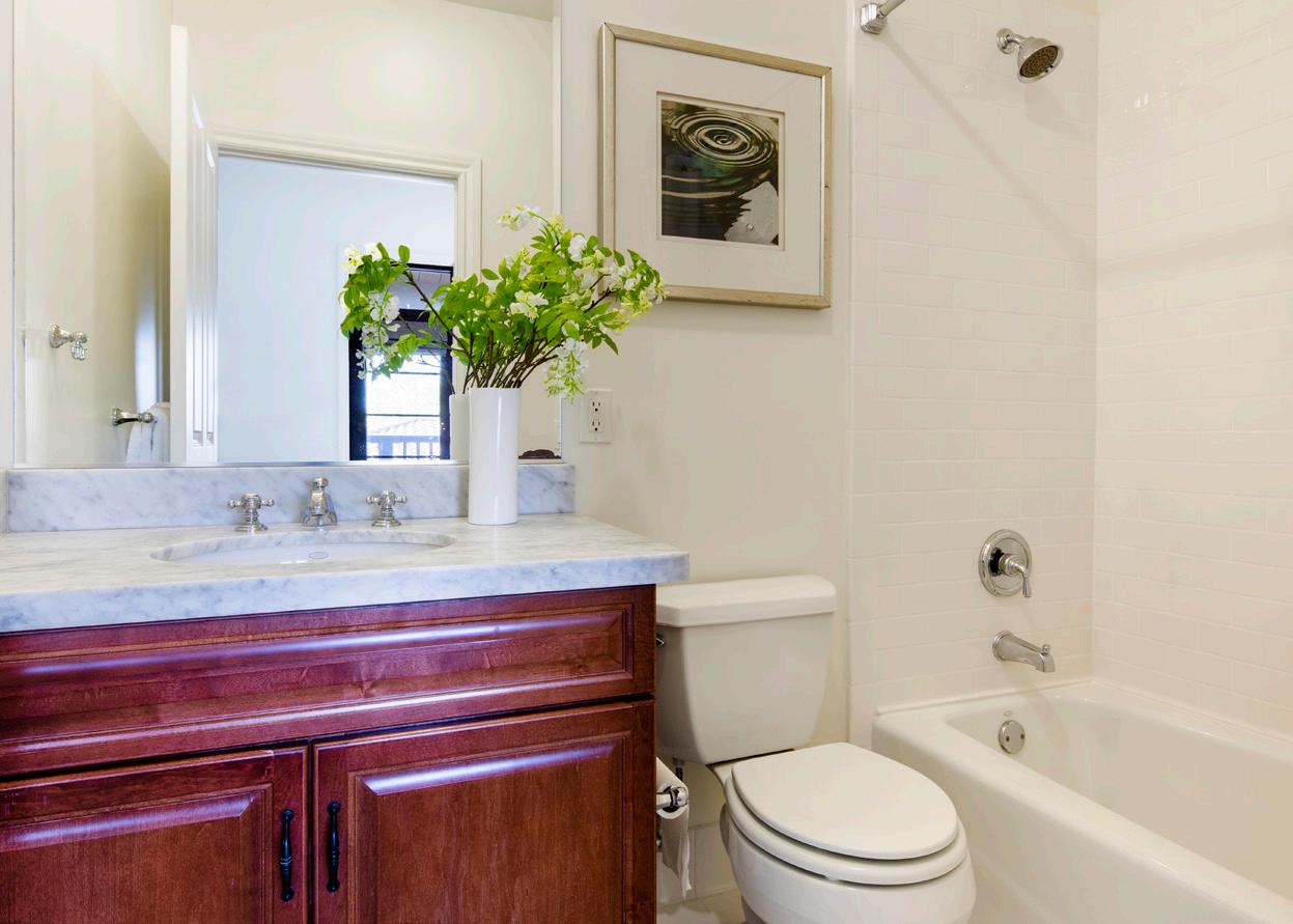 • Both of the home’s bedrooms are en suite, with the primary suite enjoying a walk-in closet, dual-sink vanity, soaking tub, and step-in shower