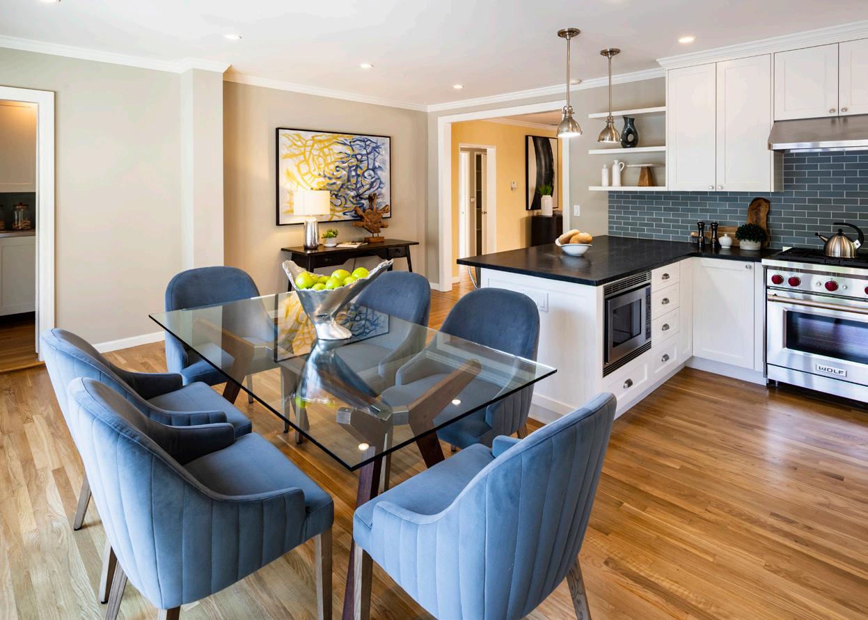 • The remodeled kitchen enjoys black granite countertops with a breakfast bar, a subway tile backsplash, and stainless-steel appliances from Wolf, Bosch, and Liebherr