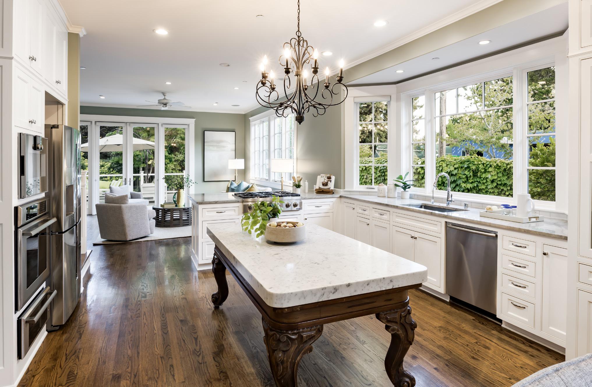 • A sunny eat-in area with banquette seating introduces the kitchen, featuring ample cabinetry with builtin china storage, and a spectacular, freestanding, marble-topped island