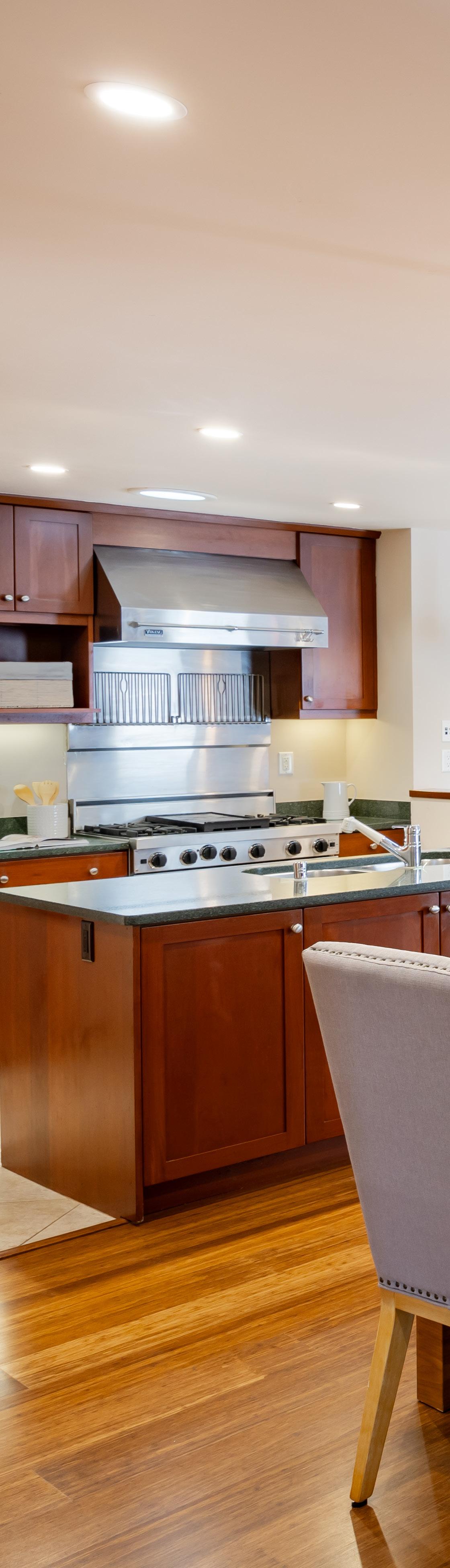 • Chef’s kitchen with Silestone countertops, cherry cabinetry, solar sun tubes, dual-basin sink, and peninsula with seating space; appliances include Viking 6-burner range, GE Profile refrigerator, and Bosch dishwasher