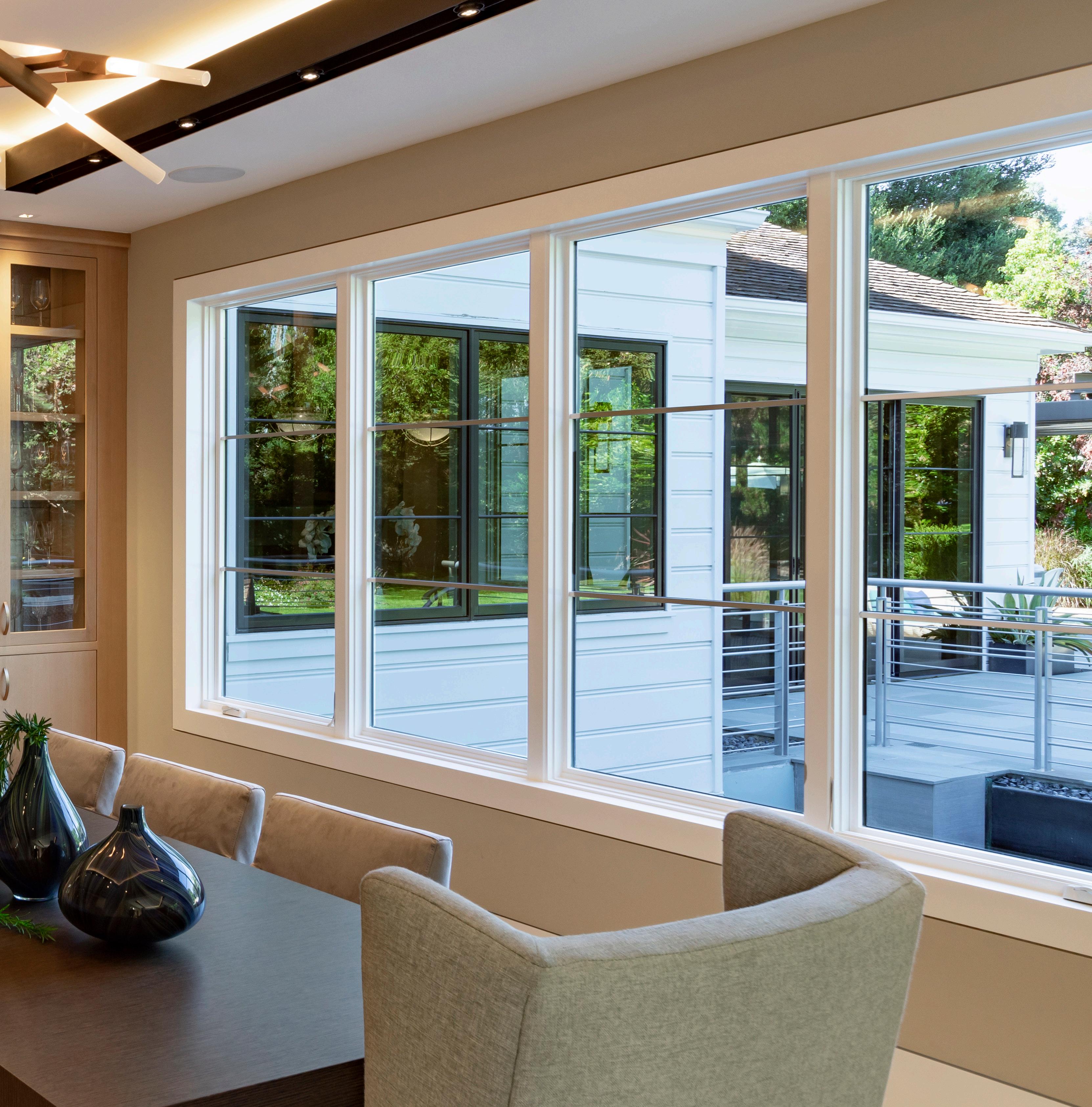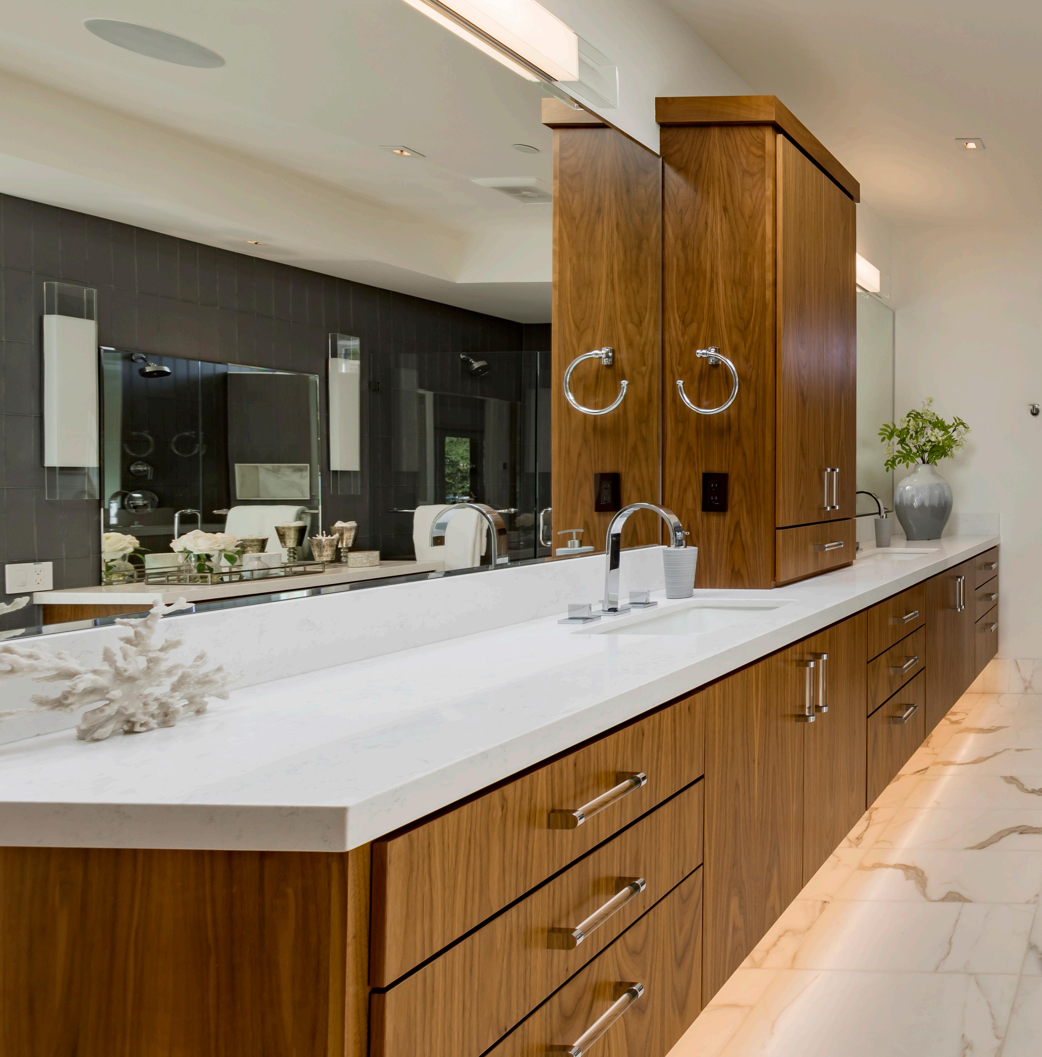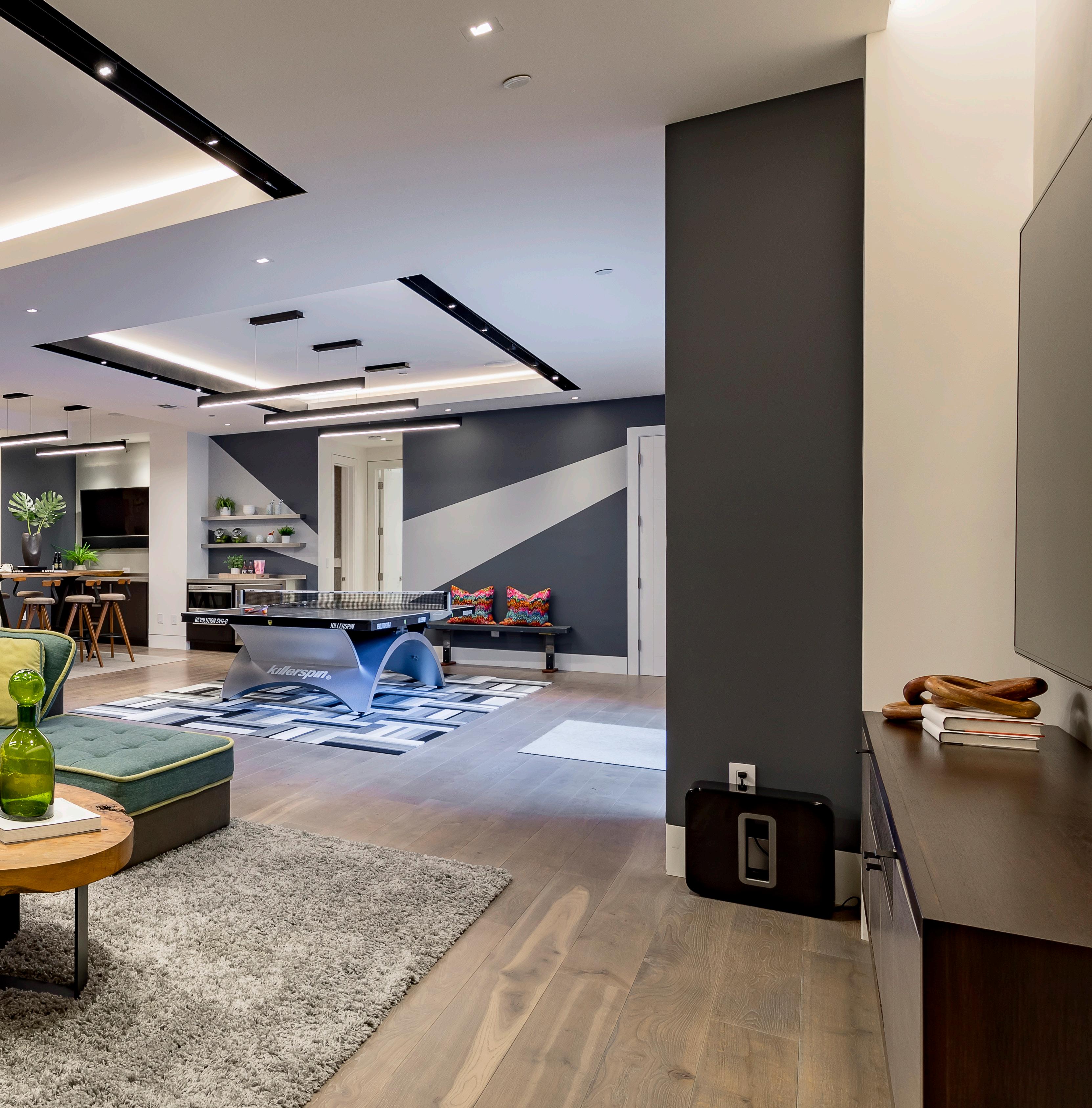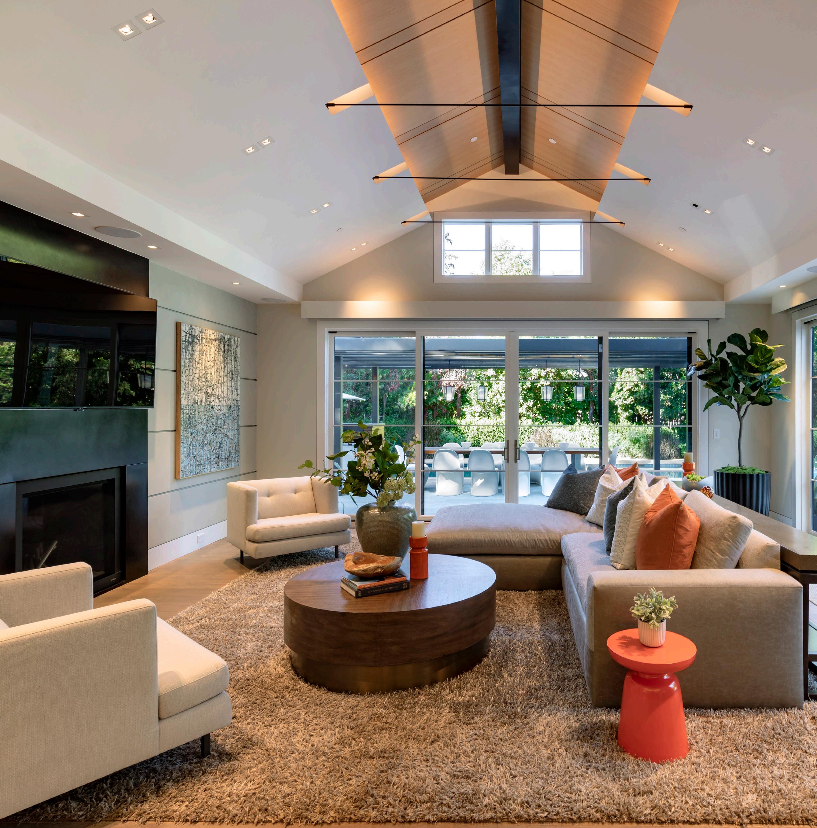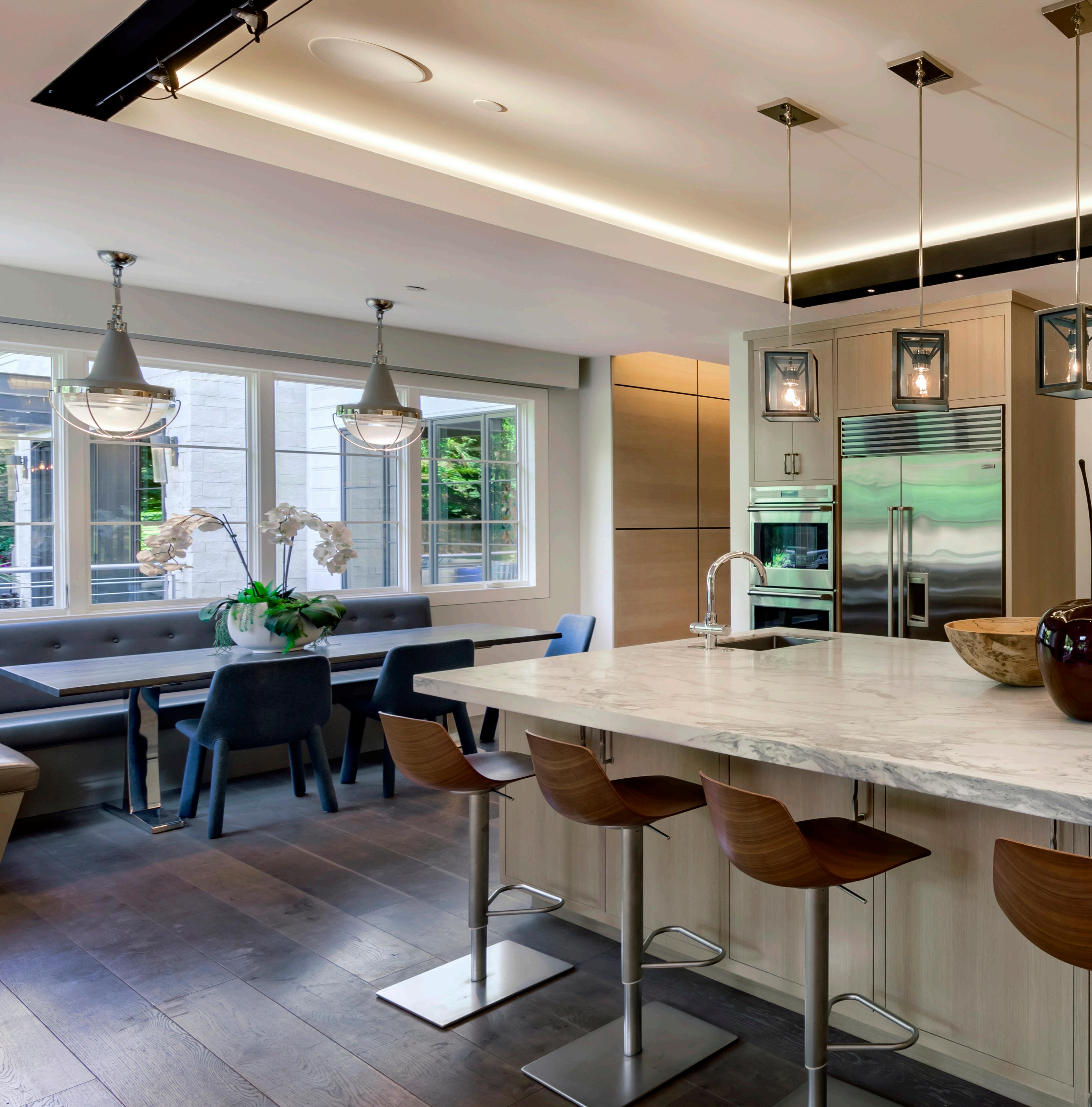 • Expansive spaces scaled for entertaining begin in the living room with a linear fireplace, and continue into the dining room with built-in cabinetry and a nearby wet bar area