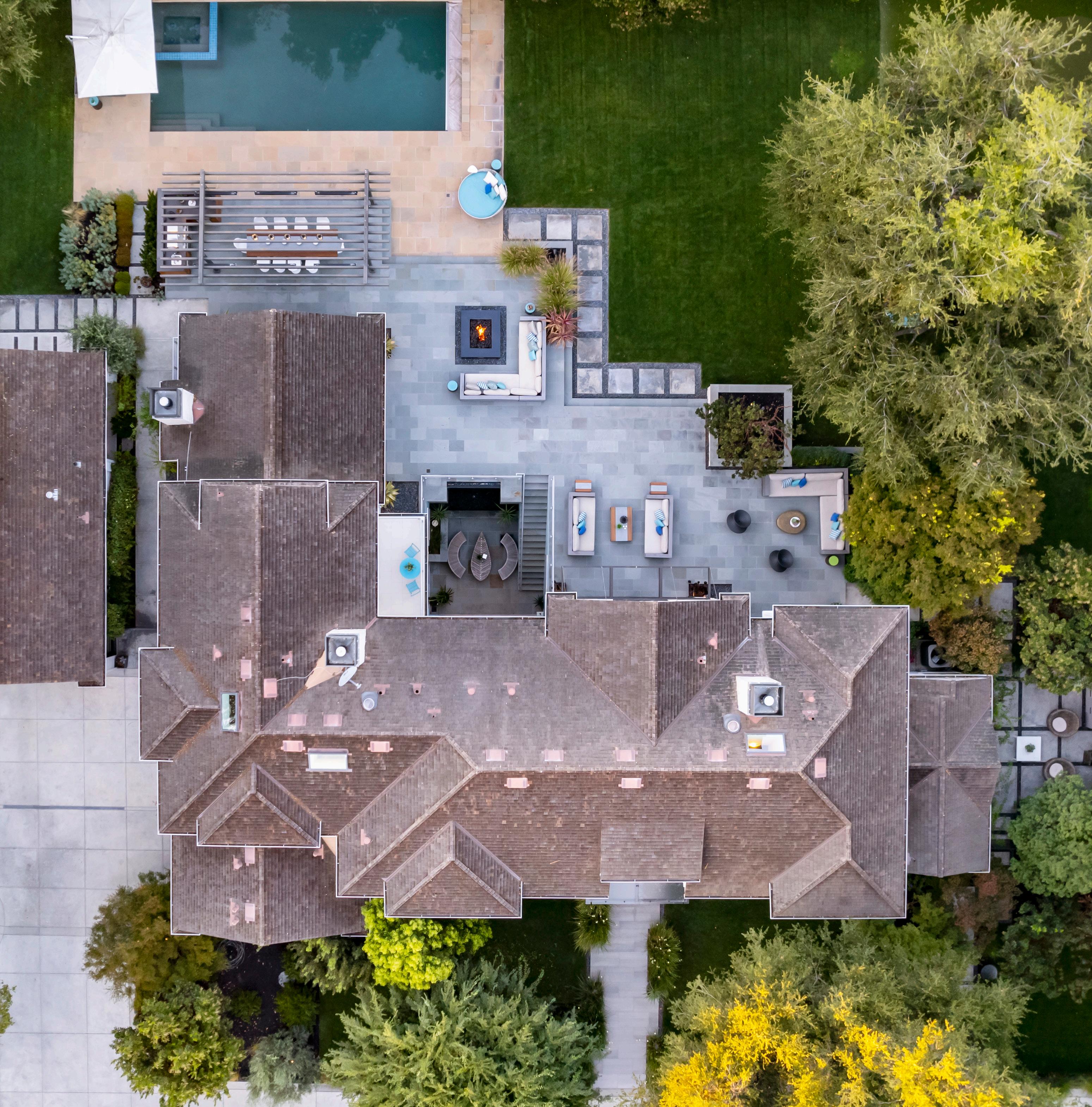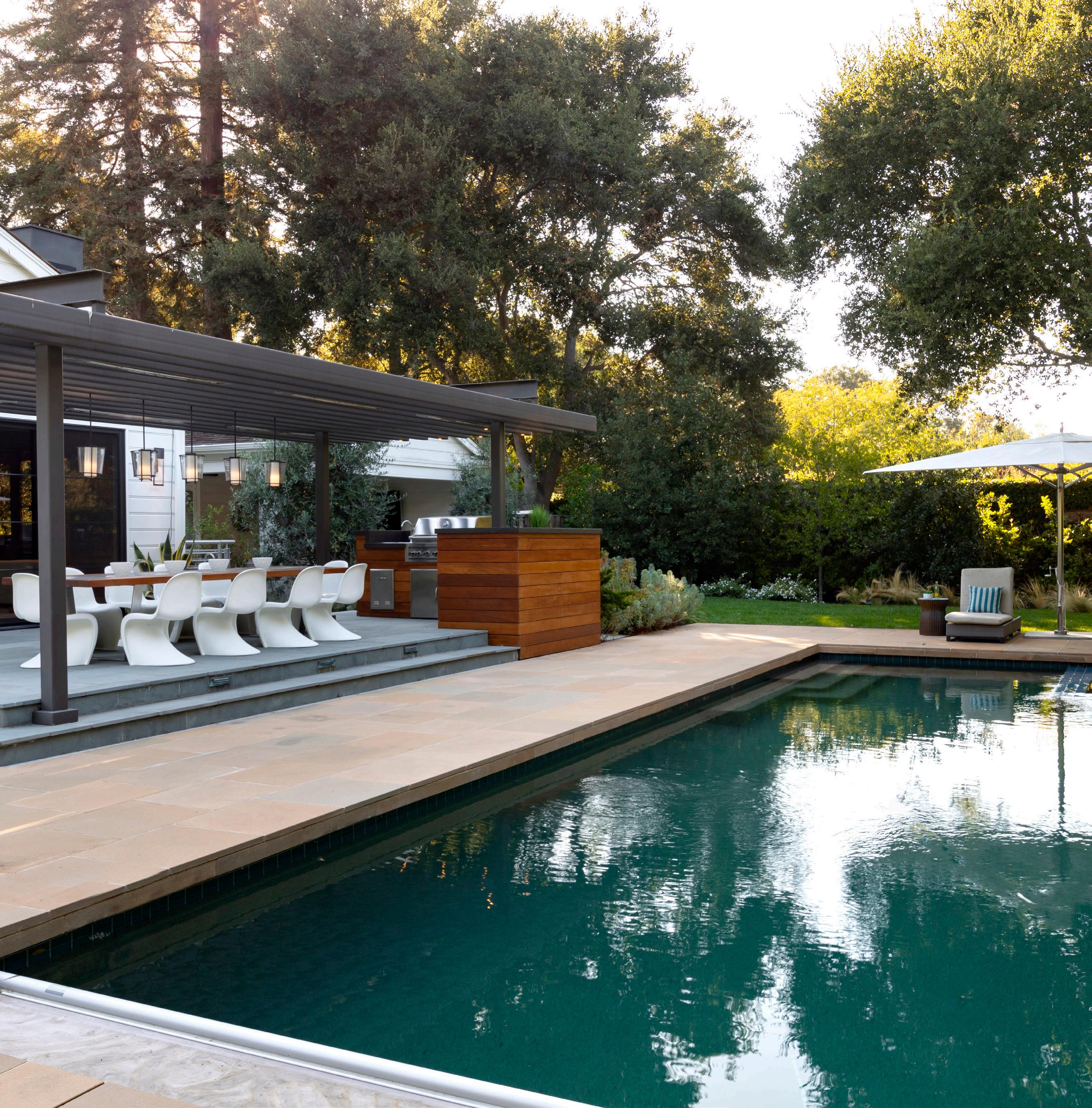 • Enjoy a true indoor/outdoor lifestyle on sprawling grounds that include a pool, patio space, outdoor kitchen, and an open, covered pool house perfect for relaxing while watching the game